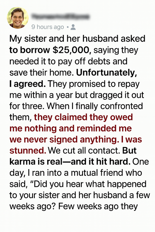I cut them off. Blocked their numbers. Told my parents I wouldn’t attend gatherings if they were there. Losing my sister hurt far more than losing the money, but betrayal has a weight that crushes everything beneath it.