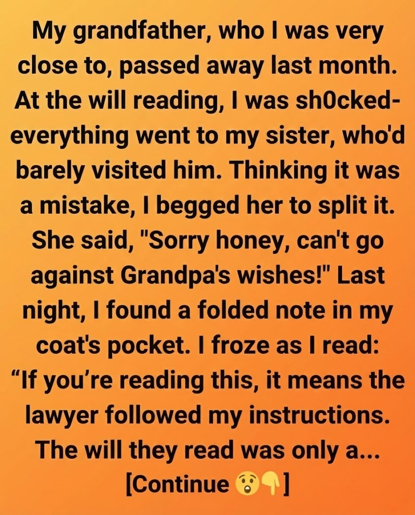 My grandfather, whom I was incredibly close to, passed away last month. When the will was read, I was stunned to learn that he had left everything to my sister—the car, his savings, and the small house. She had barely visited him, and I couldn’t understand how that made sense.