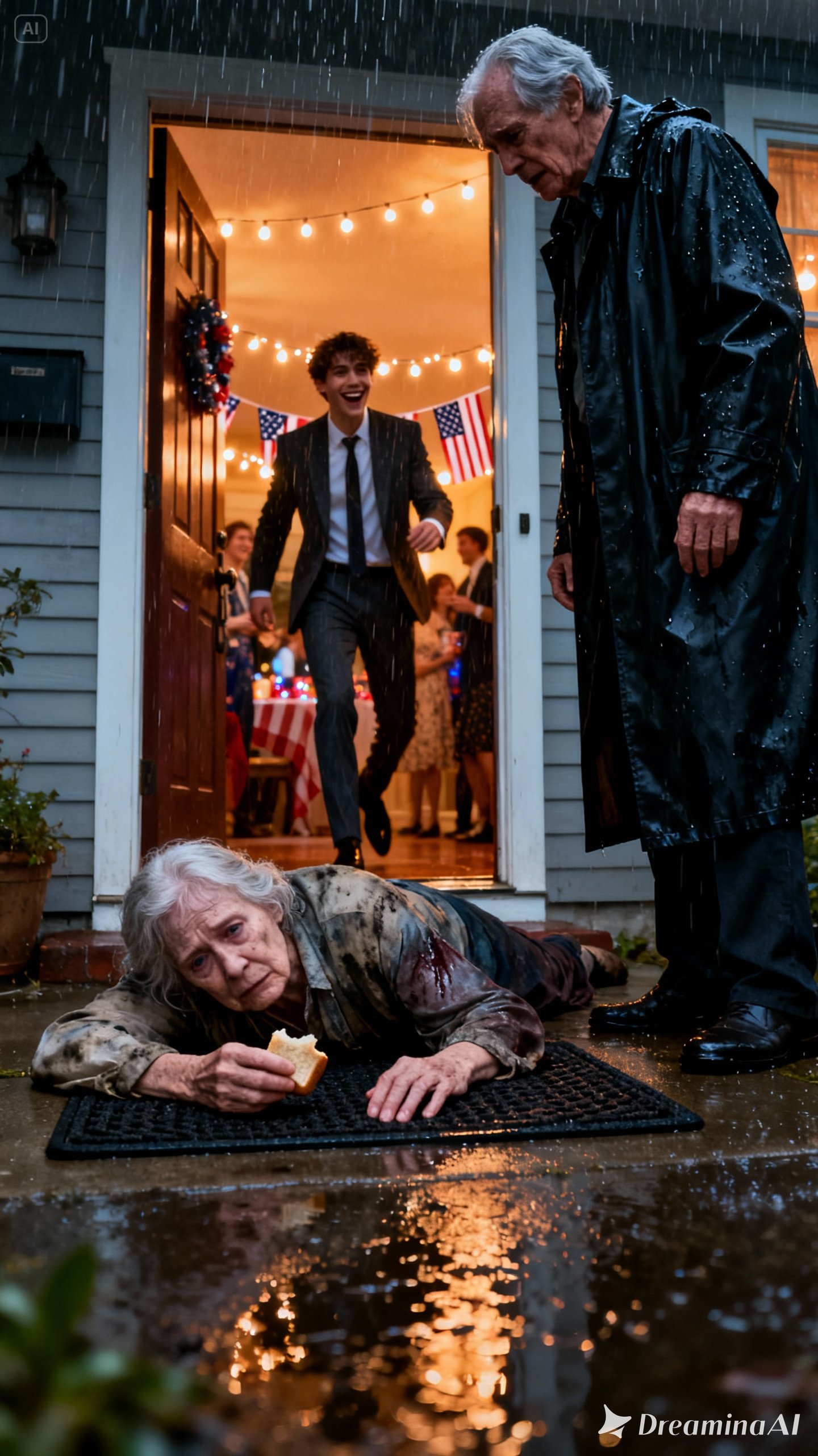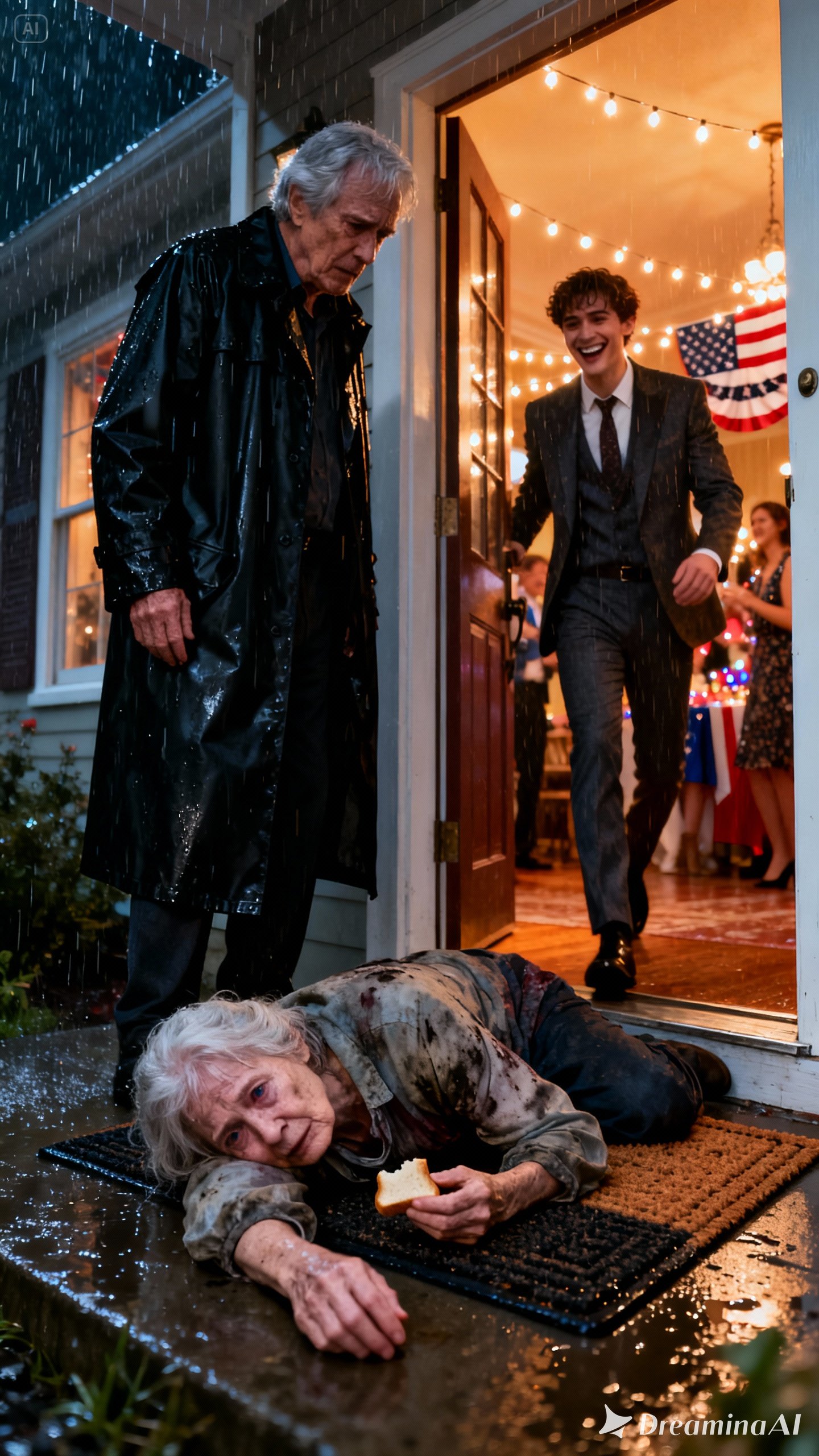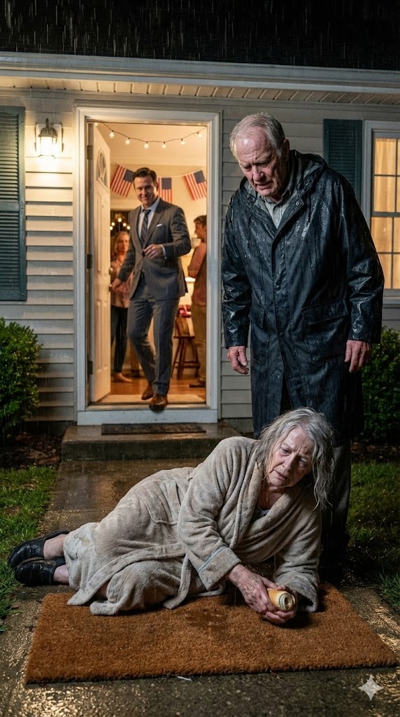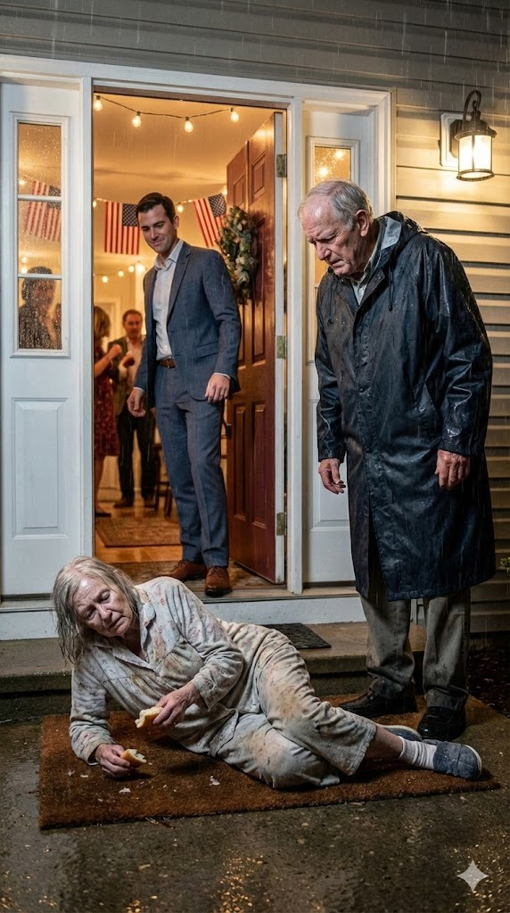 I arrived home unannounced to find my wife, Beatatrice, sleeping on the doormat in the freezing rain, wearing nothing but rags. My son-in-law, Braden, wiped his muddy designer shoes on her sleeve and laughed, telling his guests she was just the “crazy maid” who liked to sleep outside like a dog. I didn’t scream. I didn’t shout. I stepped out of the shadows, and the laughter died instantly because Braden was wearing the $1,200 shoes I had bought him.