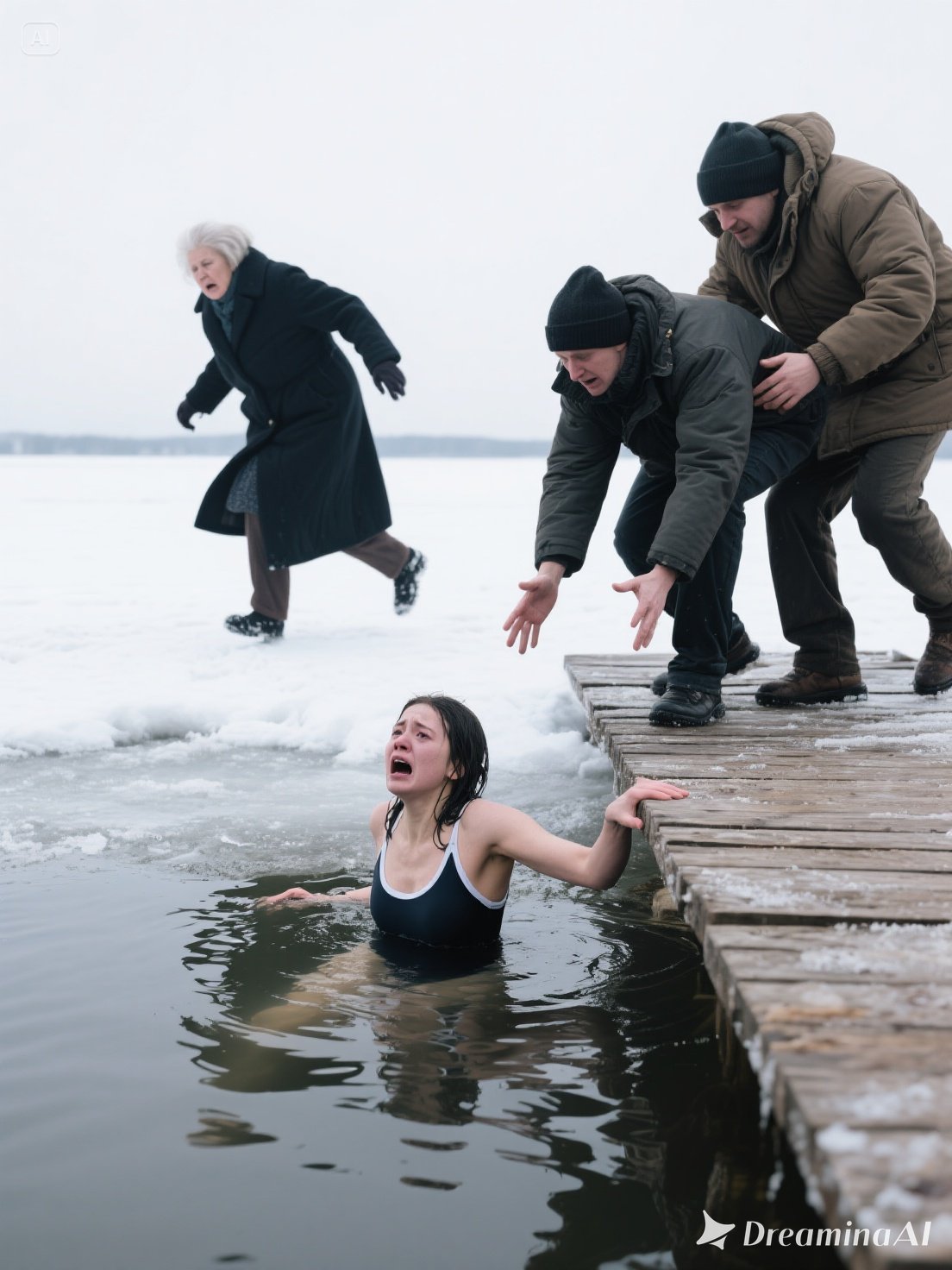 Mia flew off the dock, breaking through the thin ice and plunging into the black, freezing water with a sickening splash.