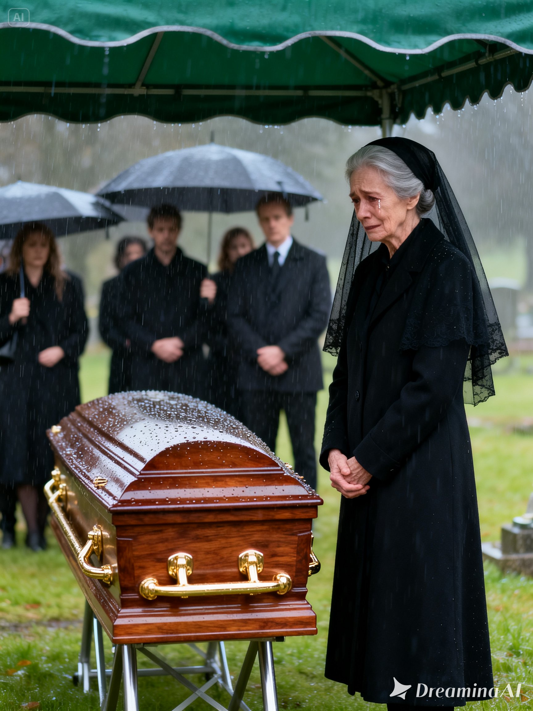 As the mahogany coffin slowly descended into the earth.