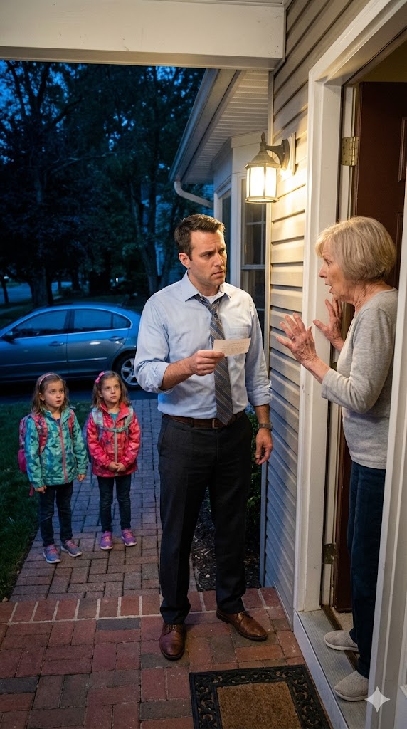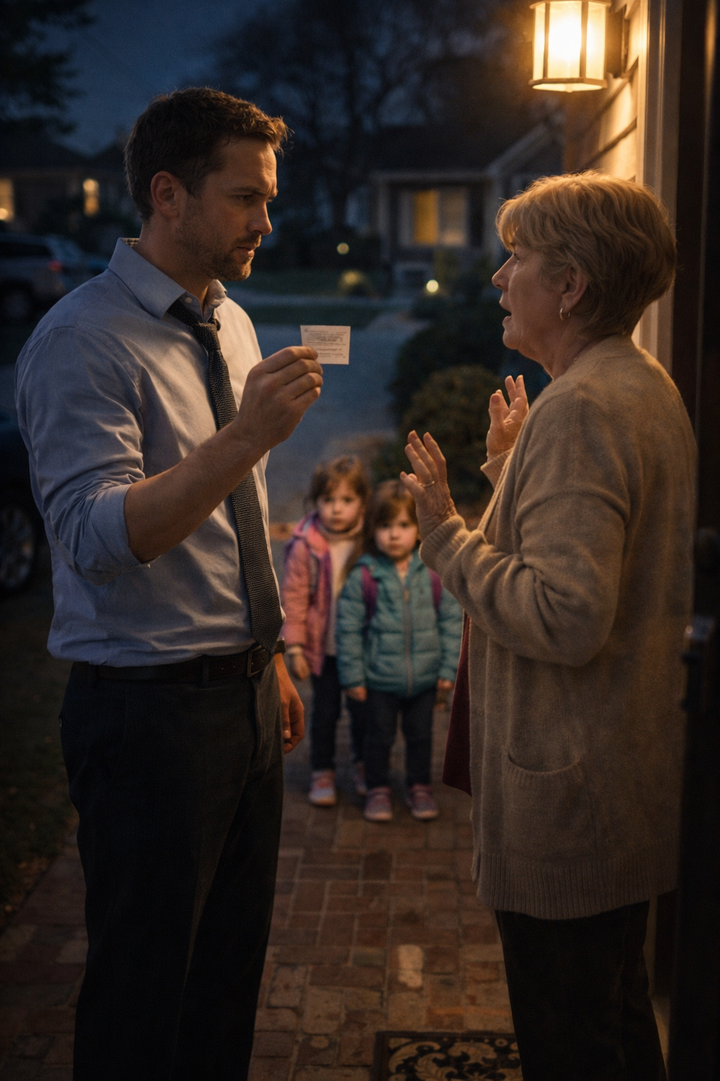 I stopped with my hand resting on the doorknob, exhaustion pressing behind my eyes. My shirt collar was still damp from the rain, and the only noise was a neighbor’s lawnmower humming a few houses away.