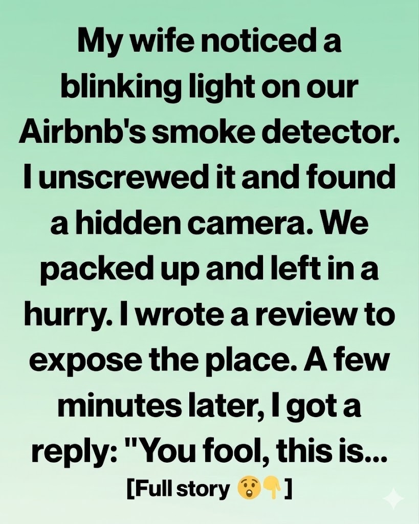 My hands trembled as I opened my laptop. I logged into the rental website and quickly wrote a review, driven by anger and adrenaline. I explained everything: the blinking light, the hidden lens, the fear it caused. I warned people not to stay there.