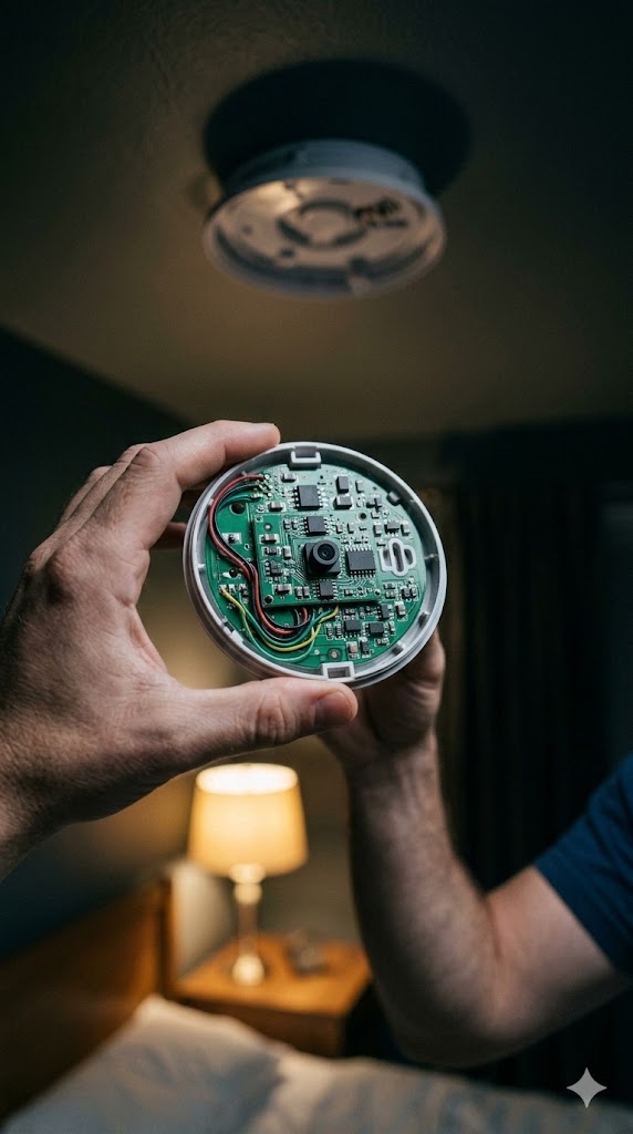 I followed where she was looking, up toward the ceiling. A tiny red light blinked once… twice… and then disappeared.