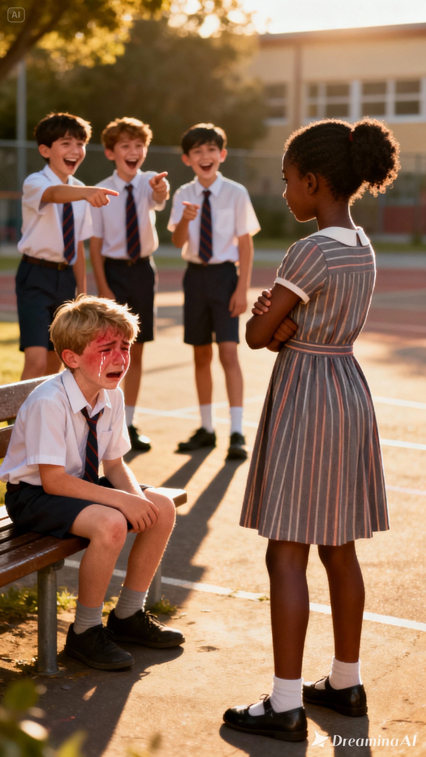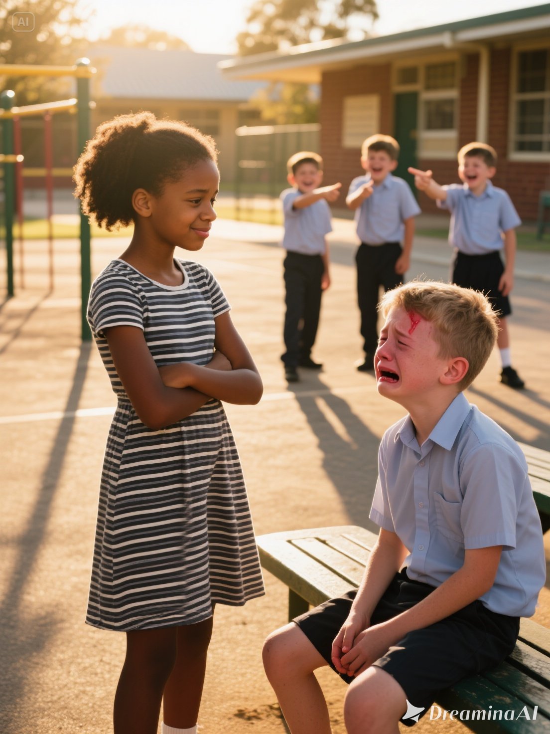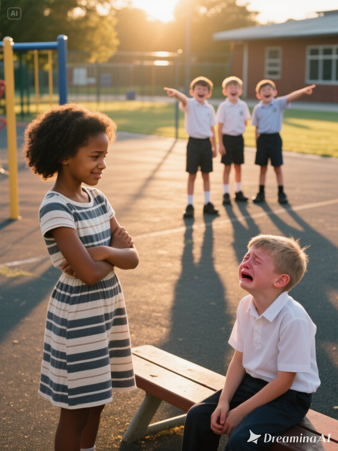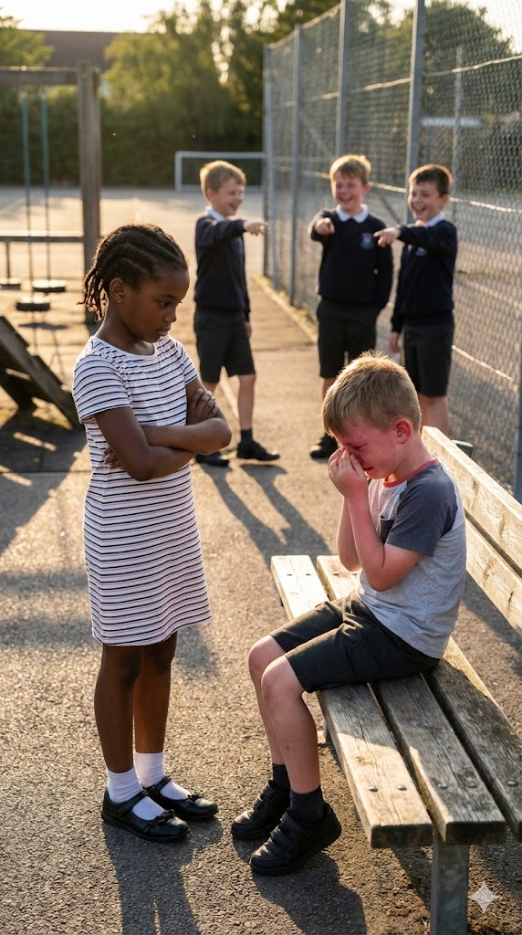 The playground quieted. Stares replaced bravado. The boys backed off, muttering threats as they left.