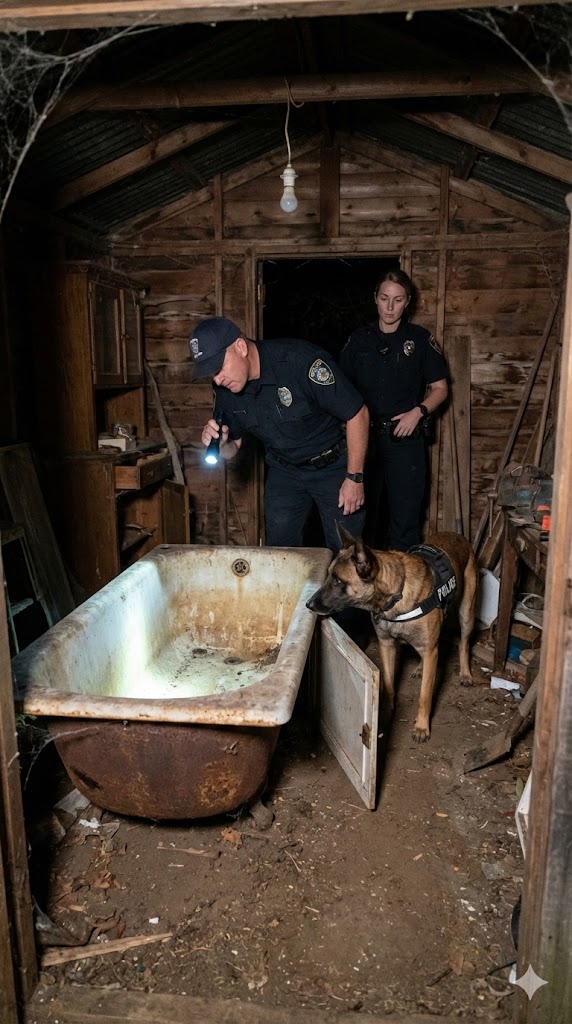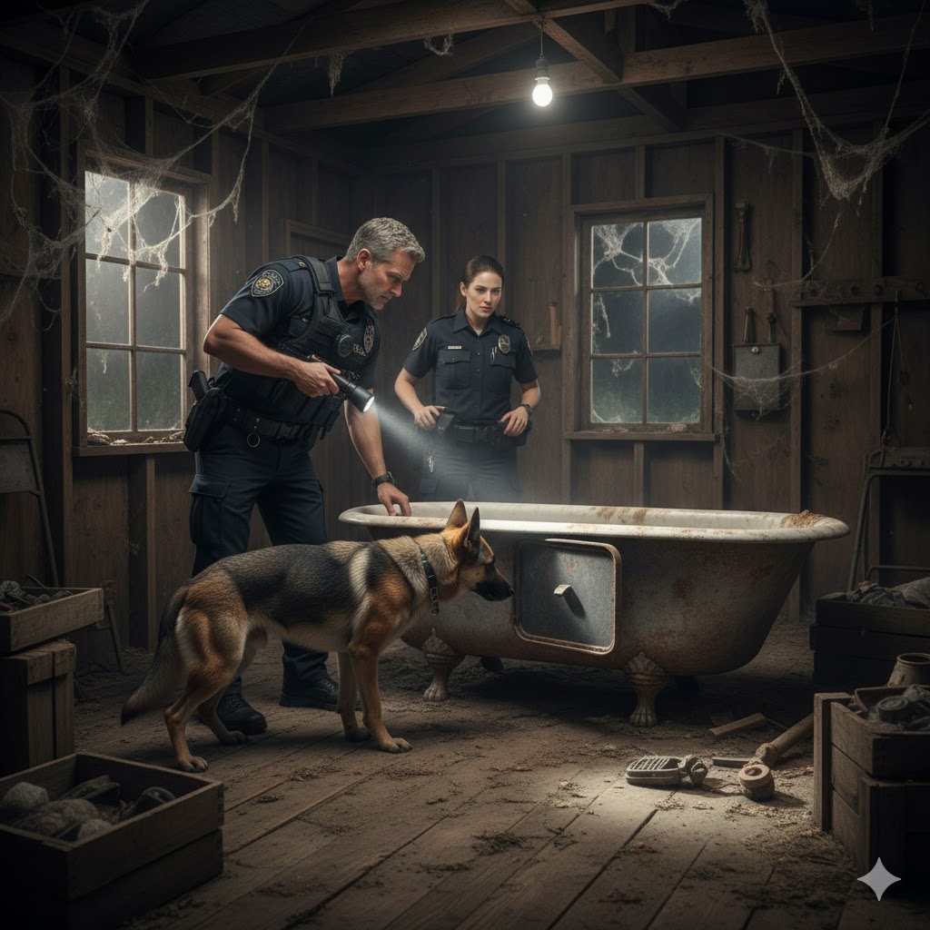 Buster lunged at the tub. He didn’t inspect it—he went after it. He clawed wildly at the base, flinging mud backward into my legs. Then he started biting the metal, his teeth ringing loudly against the iron.