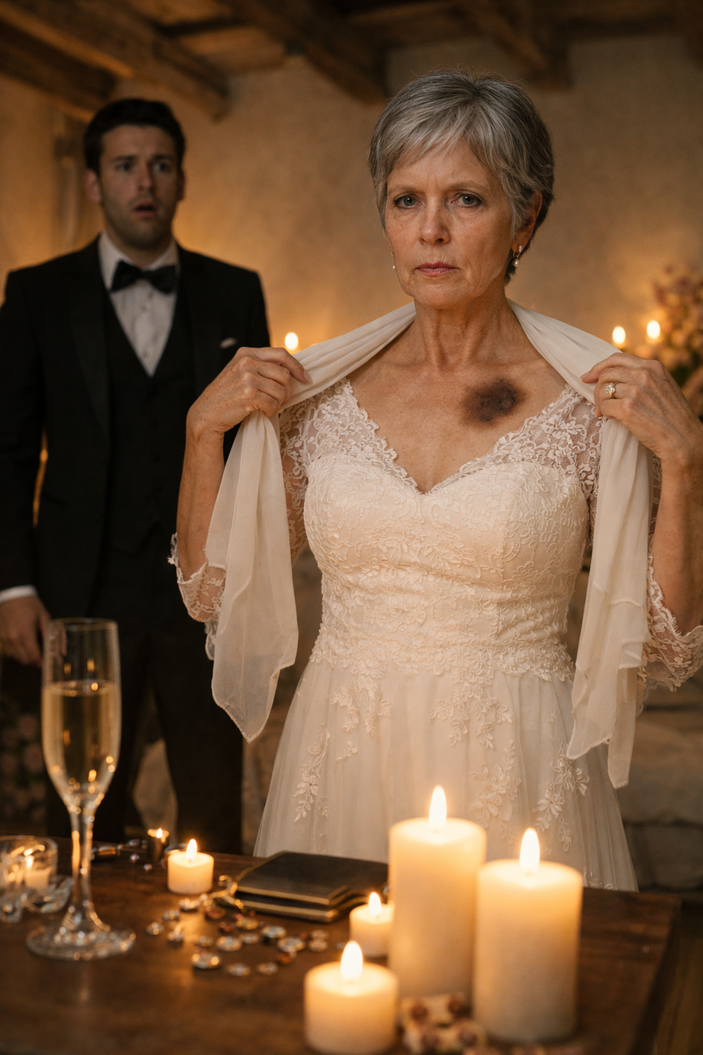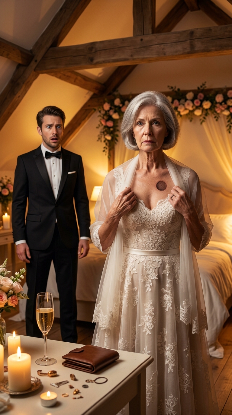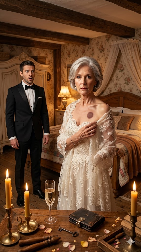 On our wedding night, my sixty-year-old wife slowly lowered her shawl, revealed a mark on her shoulder, and whispered, “Before you touch me, you need to know who I really am.”
