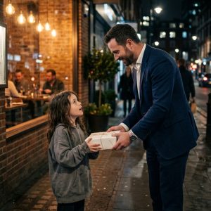 He believed he was giving just one meal to a single hungry girl.That was it.Only a white takeout box.Only a small act of kindness outside a softly lit...