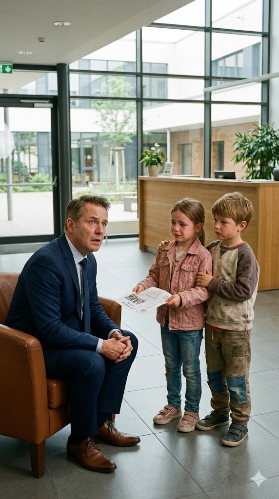 Standing in front of me were two children. Twins. A boy and a girl, maybe eight years old. They looked like shadows in a place they didn’t belong. The boy wore a jacket clearly too large for him, sleeves awkwardly rolled up, revealing wrists marked with faint bruises. The girl had on a faded pink dress, its hem unraveling, and sneakers barely holding together with strips of gray duct tape.