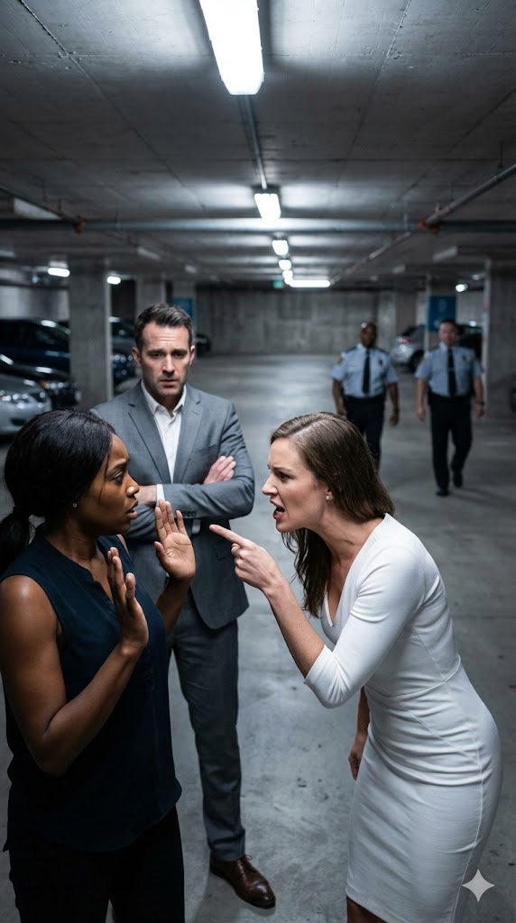 The garage smelled of exhaust and damp concrete. Fluorescent lights hummed overhead. She pulled into an open spot. No signage. No reservation. She was lifting her briefcase when the horn blasted—long, aggressive, demanding. A white Mercedes had stopped inches behind her. Too close.