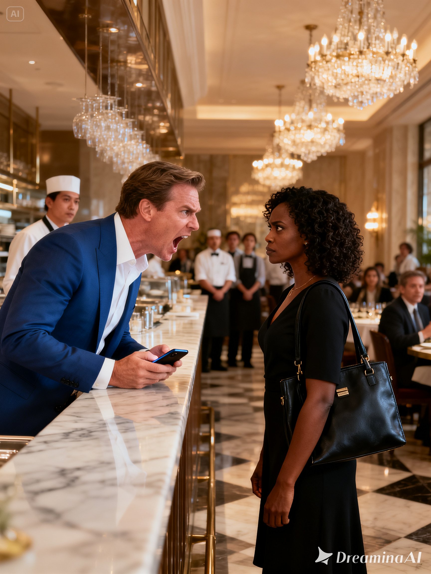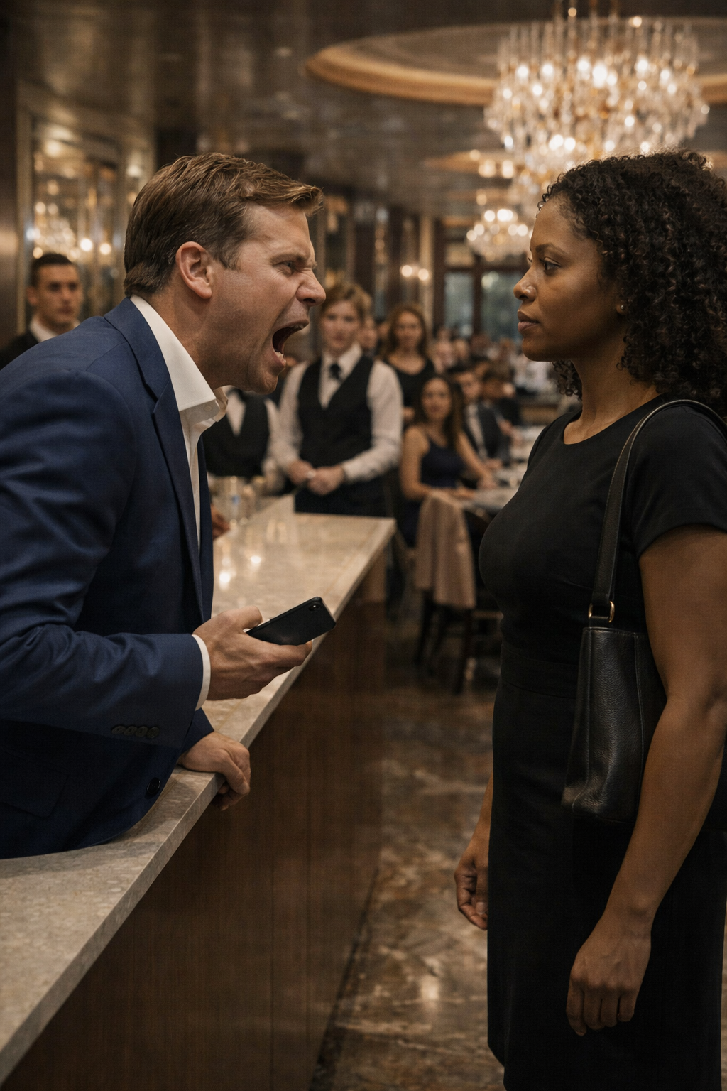 Marcus steps forward to intercept them. Excuse me. We’re dealing with a situation here. You’ll need to wait at the hostess station. David looks at Marcus with mild confusion. We have a reservation. Thompson party for three. Jessica, the hostess, scrambles to check her book. I I don’t see. Patricia opens her briefcase and produces a confirmation email on letterhead.
