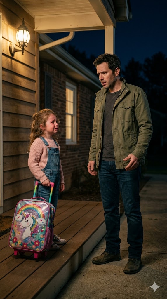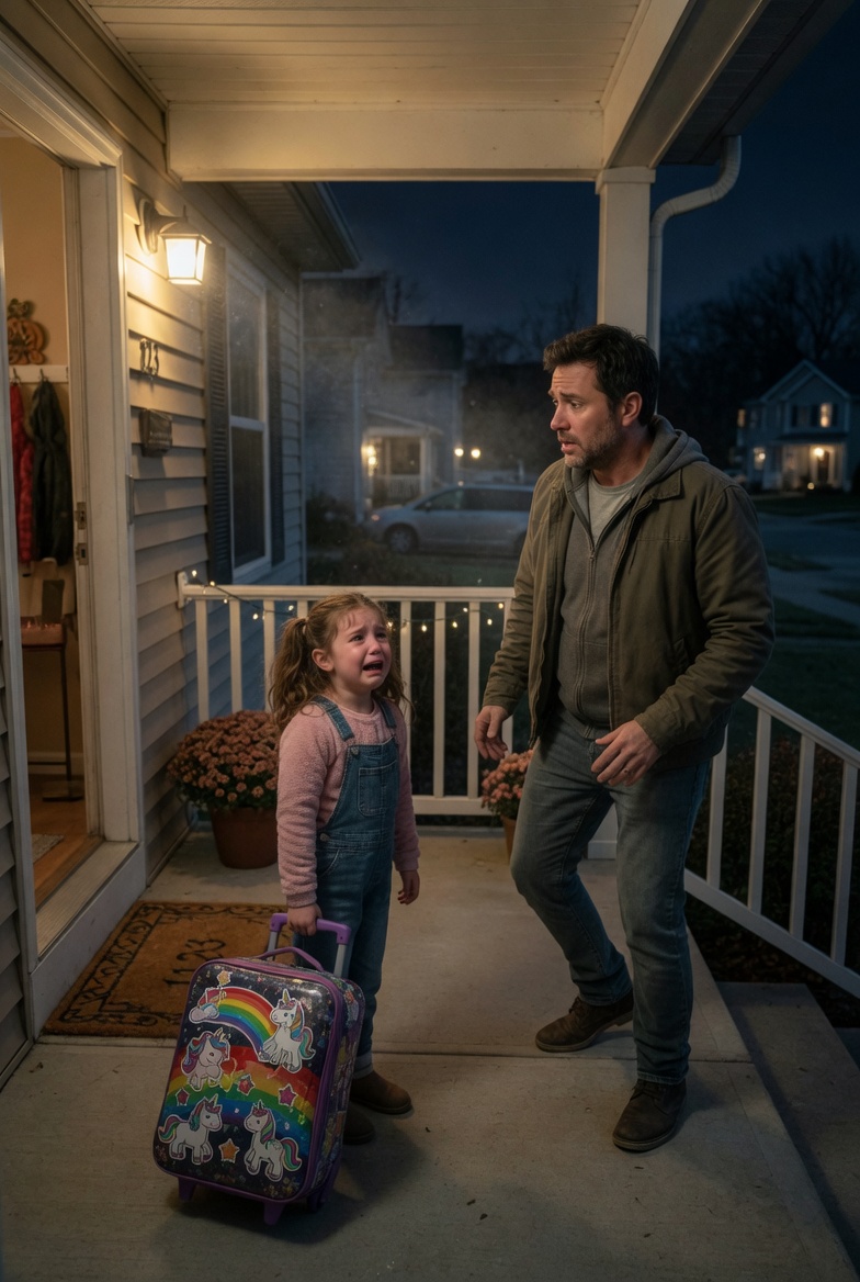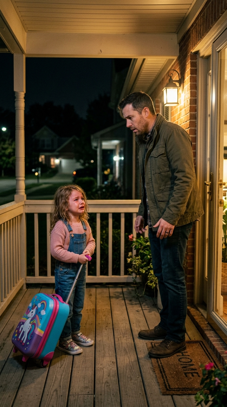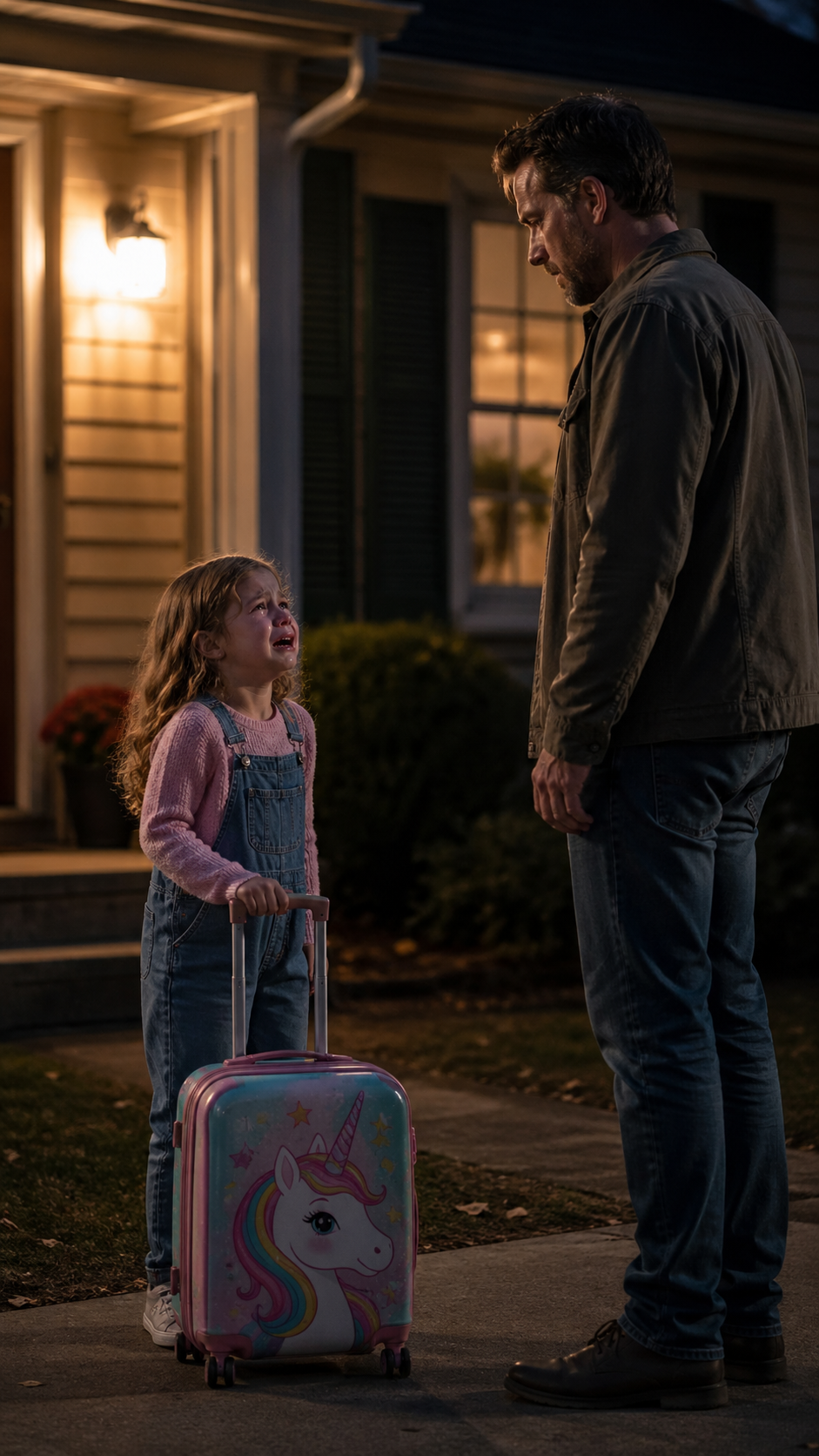 The first thing I noticed wasn’t the silence—it was my daughter’s hands, trembling uncontrollably, her small fingers wrapped around that unicorn suitcase as though releasing it meant losing herself entirely. Standing beneath the faint glow of the porch light with the cold wrapping around us, I felt a dread settle deep into my bones—the kind that tells you the next words spoken will tear apart everything you believed about your home, your life, and the woman you had given your whole trust to.