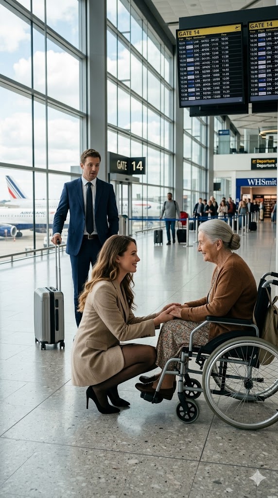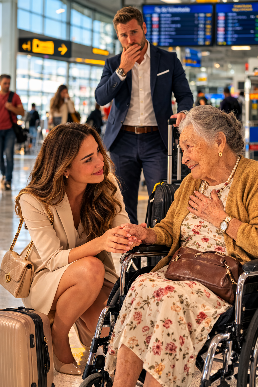Her eyes, clouded by age and now by unshed tears, searched the crowd. Her caregiver, a woman she had hired only a week earlier, had said, “I’m going to the bathroom and getting help,” more than forty minutes ago. She hadn’t come back. Mercedes’s flight was leaving in twenty minutes. Her trembling hands, marked by time, clutched her purse tightly against her chest like a life preserver during a storm. She felt invisible. Hundreds of people hurried past, focused on their phones, their watches, their own destinations, ignoring the elderly woman who seemed to shrink further into her chair with every passing minute.