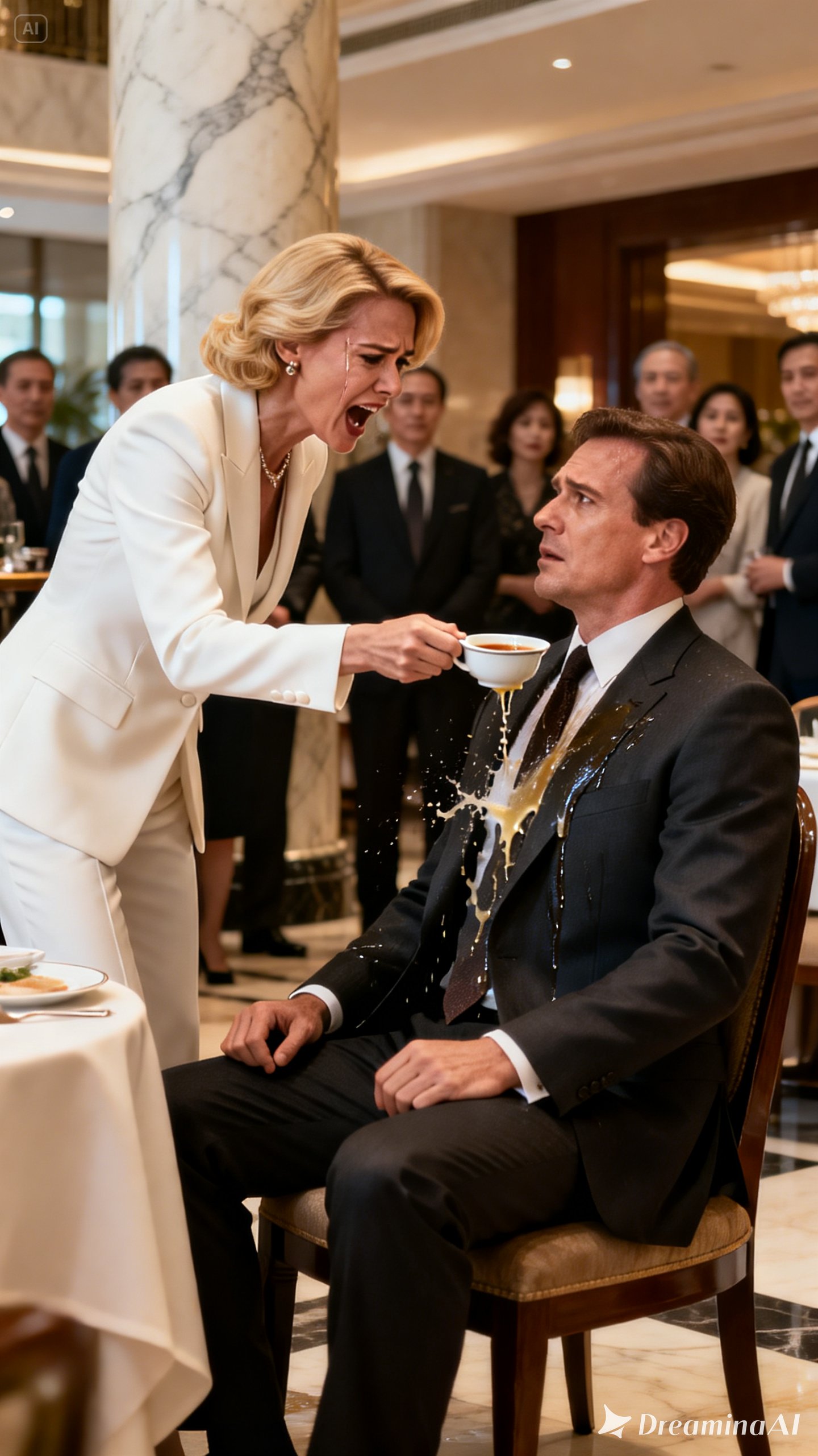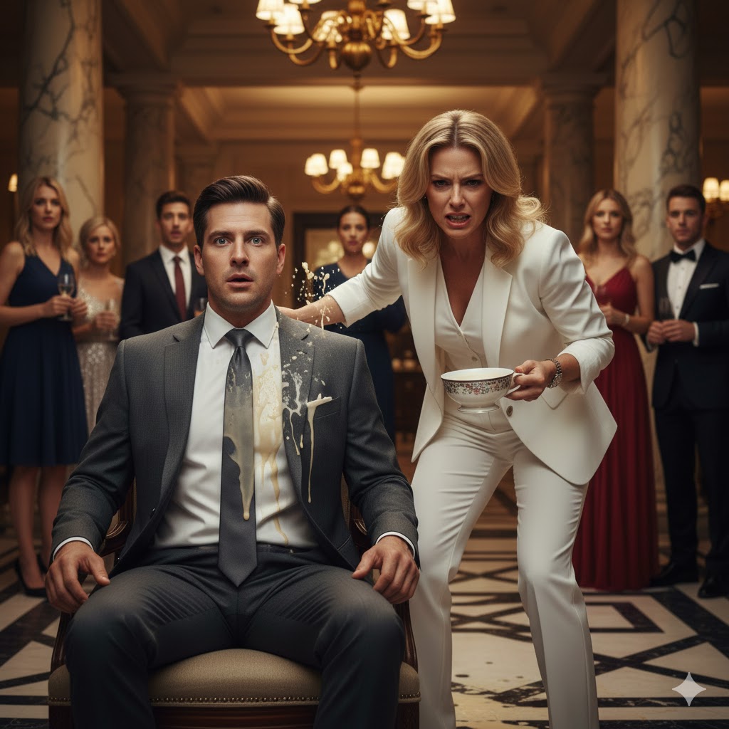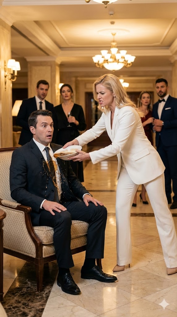 The soup poured out in one intentional motion, soaking his jacket and splashing onto the marble floor.