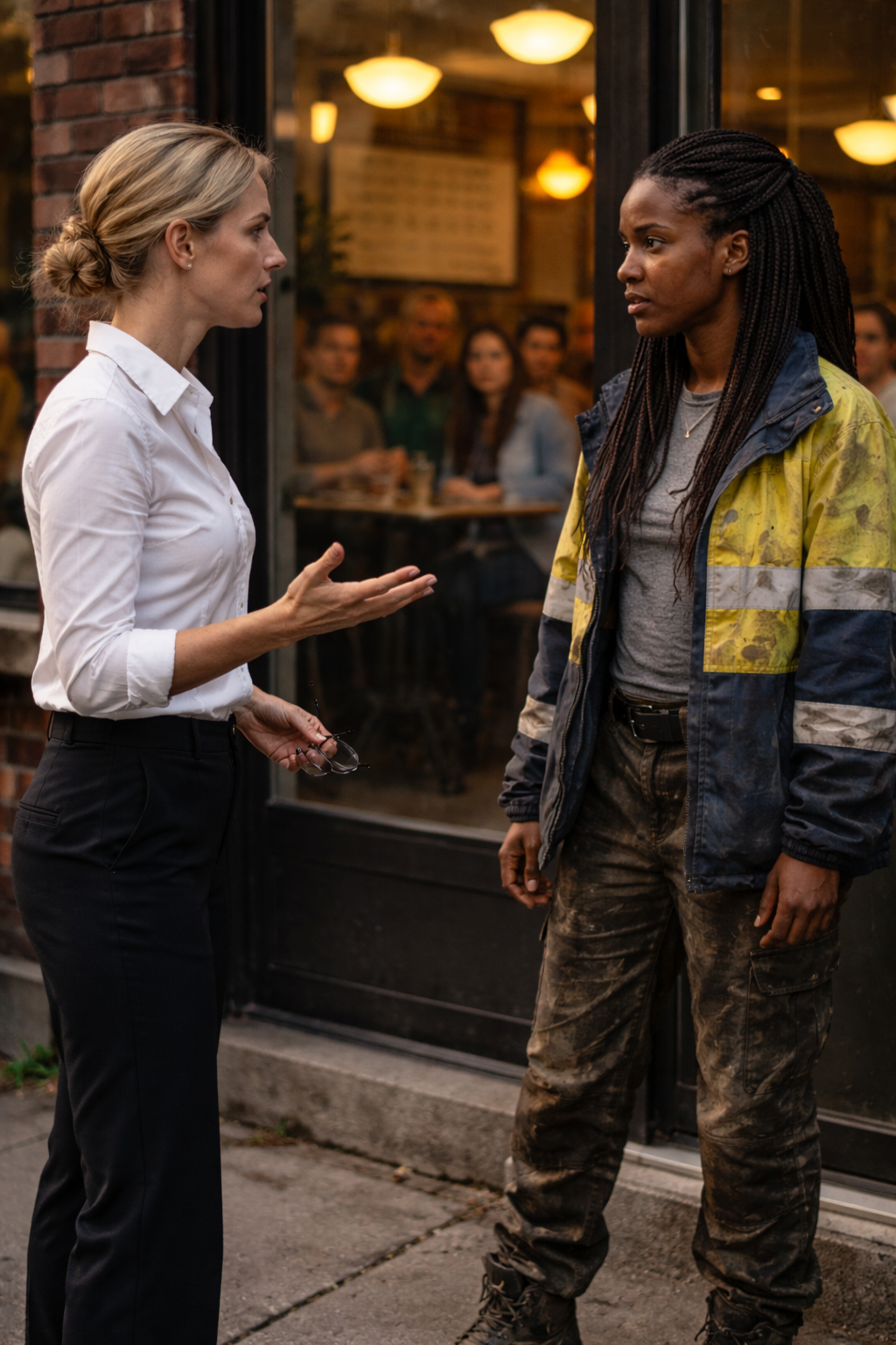 She was around thirty, standing upright despite the fatigue etched into her face. Dust and grit from a long day at a construction site clung to her skin. Her jeans were faded, her boots worn and marked, and her work jacket rested loosely on her shoulders.