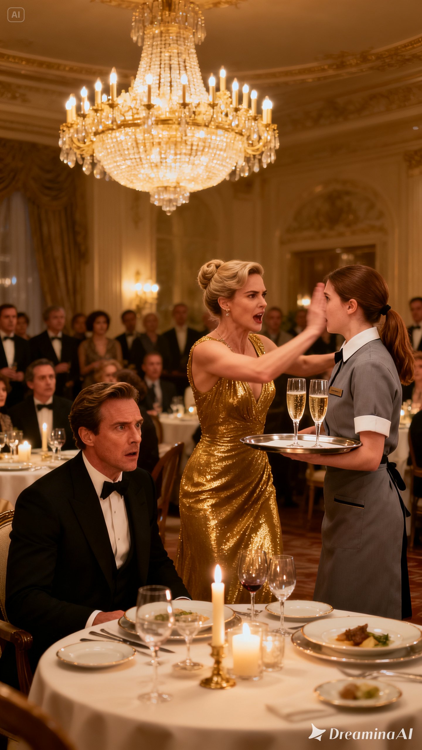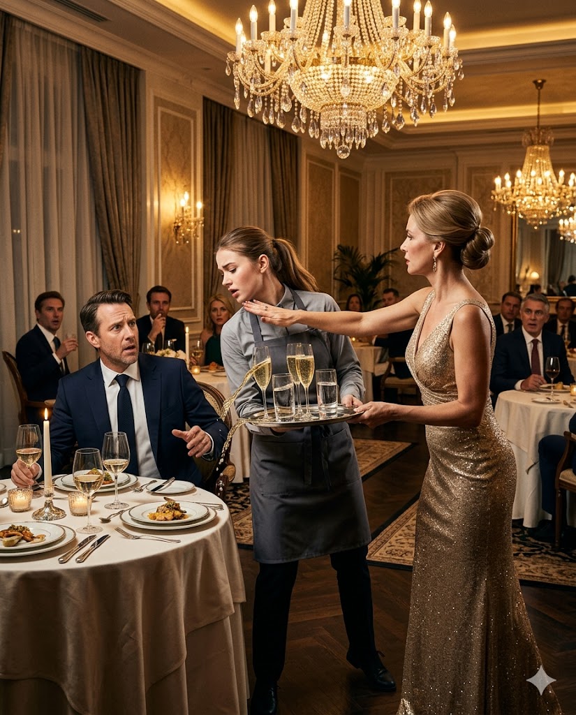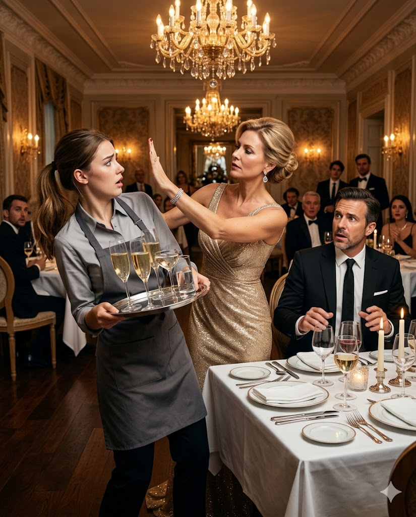 The tray slipped from the waitress’s hands, crashing violently against the floor. Glass shattered across the marble in a sharp, echoing burst that silenced the entire room instantly. Conversations died mid-sentence. Forks froze in the air. Even the piano seemed to hesitate before continuing.