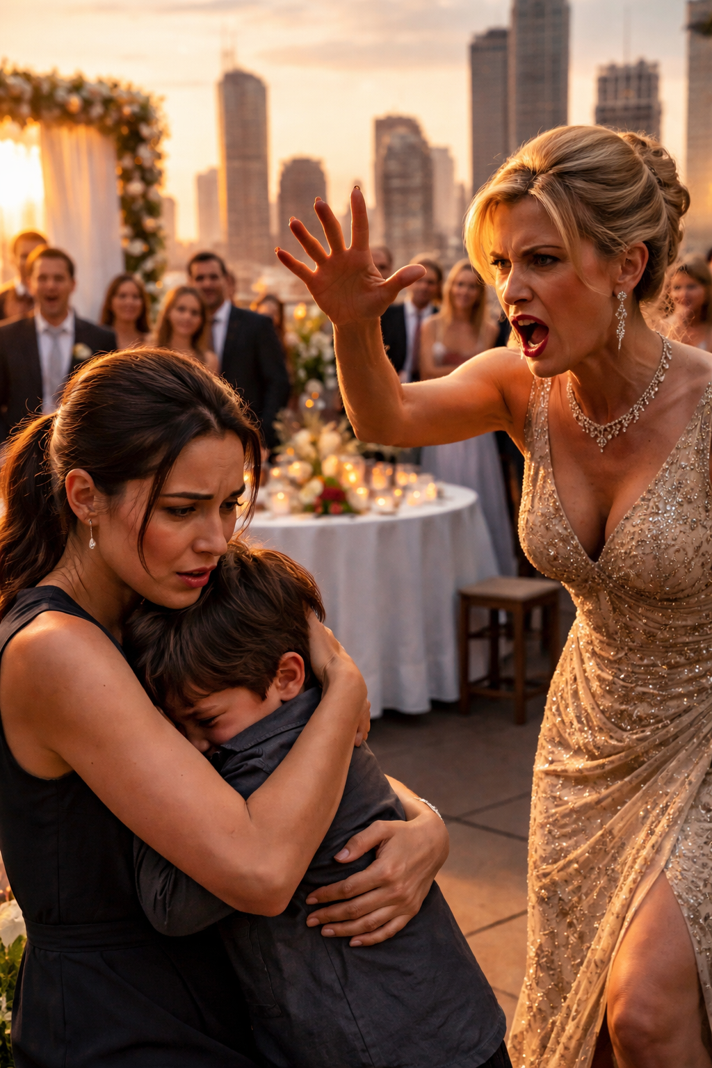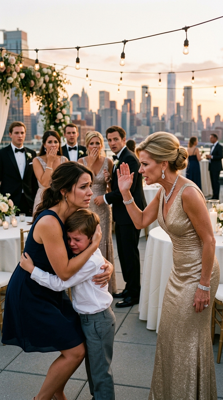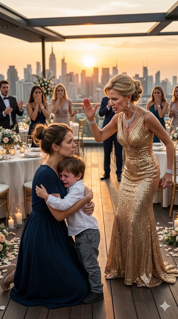 When we first stepped onto the rooftop restaurant, he stared at the hanging lights, the city skyline, the floral arch, and whispered, “Mom, is this what rich people do in the clouds?”