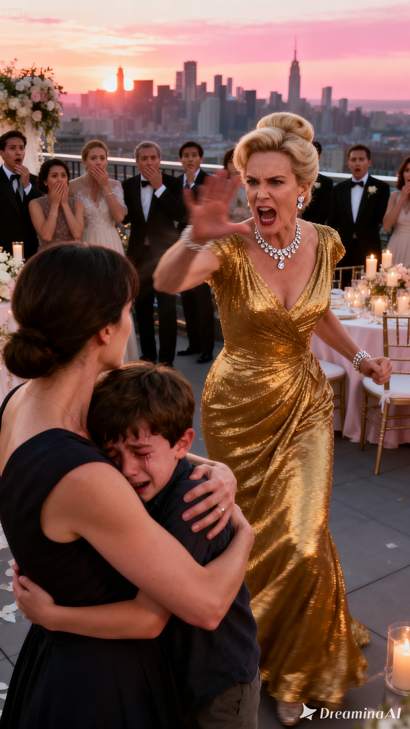 Not the bride beneath the white roses. Not the groom with his raised champagne glass. Not the guests filling the rooftop terrace with designer bags and polished smiles.