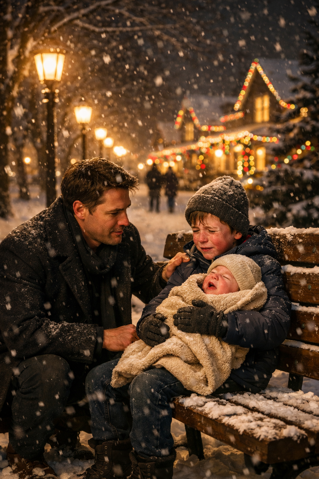 His fingers were red and cracked from the frost, yet he kept adjusting the blanket around the tiny body. He bent over her, trying to block the wind with his own chest, as if the little warmth he had could be shared between them. Inside his head he repeated the same sentence again and again, like a prayer: “Momma will be back soon.” She had promised. It was only “for a minute.” She had said, “Stay right here.” And Caleb obeyed, because children obey when the world is falling apart and the only rule they know is not to lose each other.