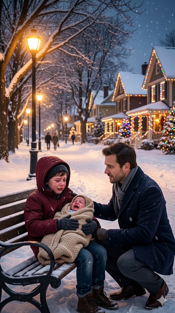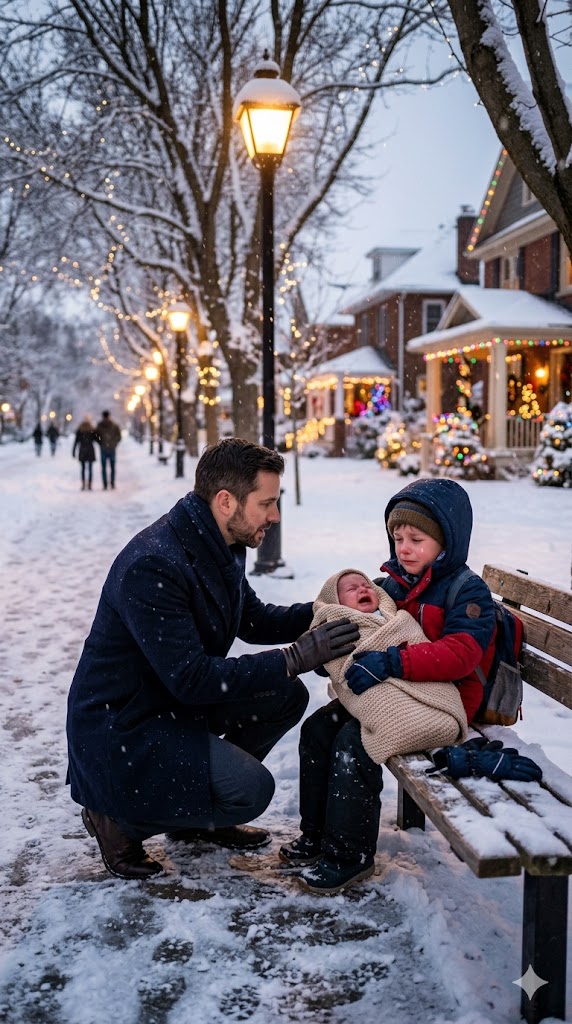 Beneath a flickering, broken lamppost, on a bench long stripped of warmth, a boy barely four years old sat perfectly still. His name was Caleb. The jacket he wore was two sizes too small, tight across his arms; still, he had zipped it up completely, as though that zipper alone could shield him from winter. His legs were pulled close, knees pressed against his chest, and snowflakes clung to his dark hair, melting slowly onto his cheeks. But what stood out most was not his stillness… it was what he held in his arms with a seriousness far too heavy for someone so small.