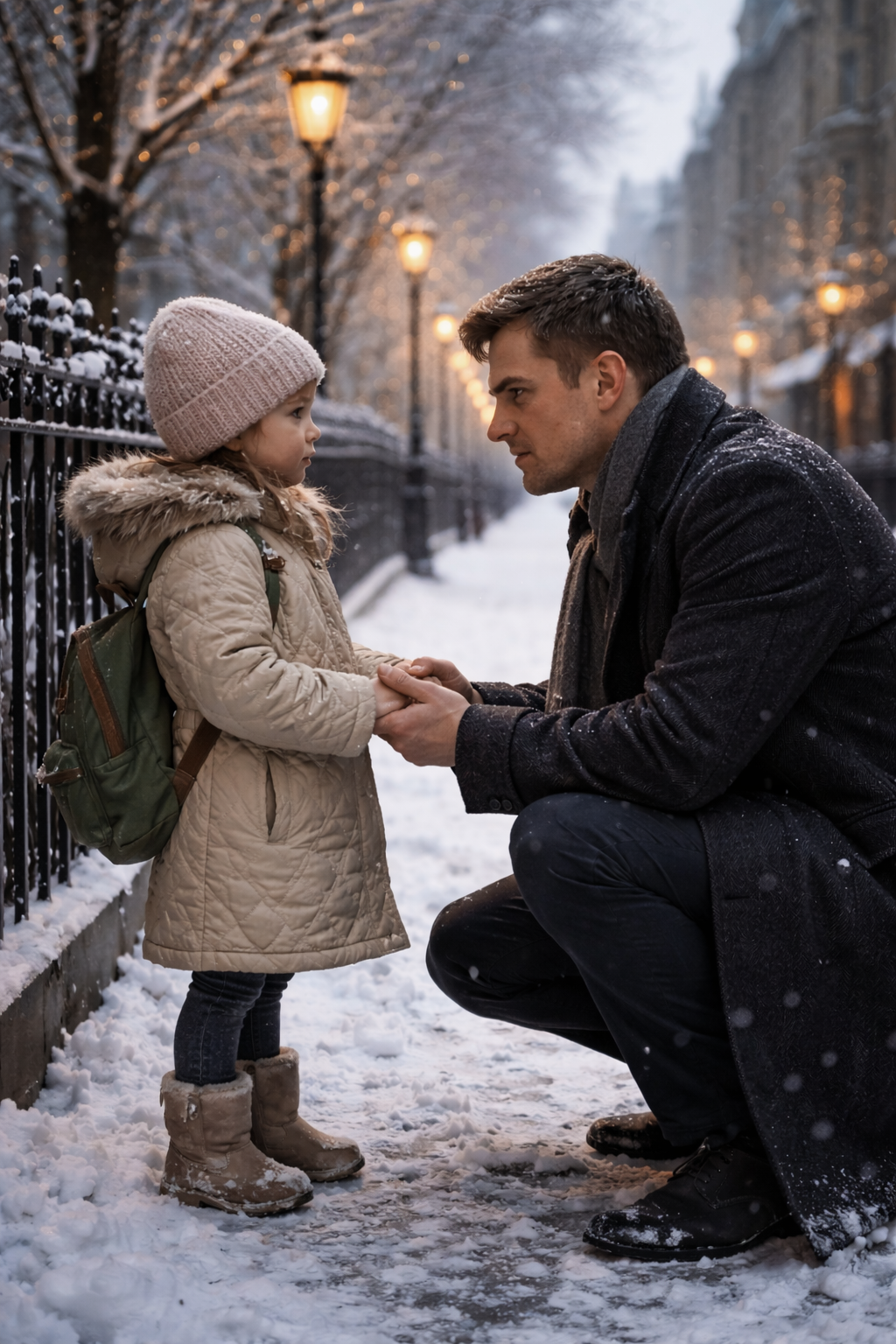 The girl startled and looked at him. Her eyes were huge—deep blue, glassy with tears. Her cheeks were raw from the wind, and snowflakes clung to her lashes like tiny stars.