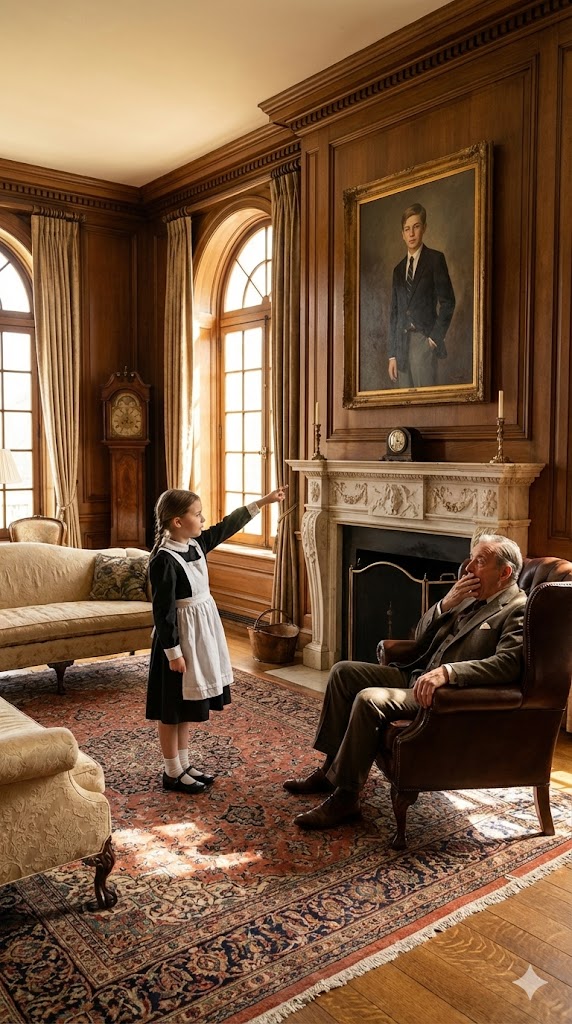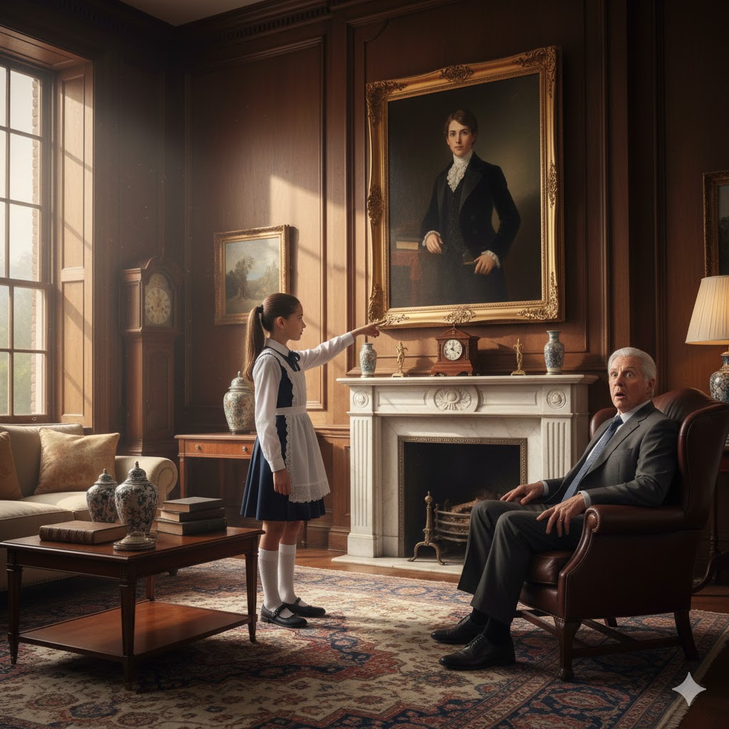 Instead, the girl stepped forward—one careful step, then another—until she stood beneath the mantel, gazing up at Lucas’s painted face.