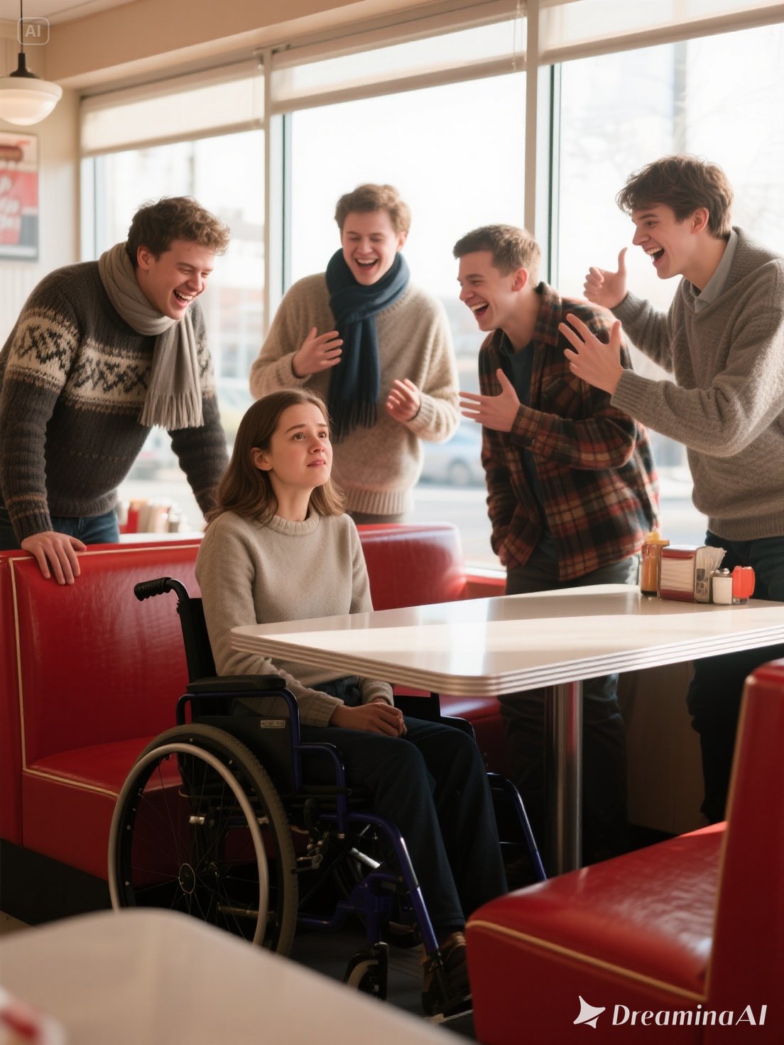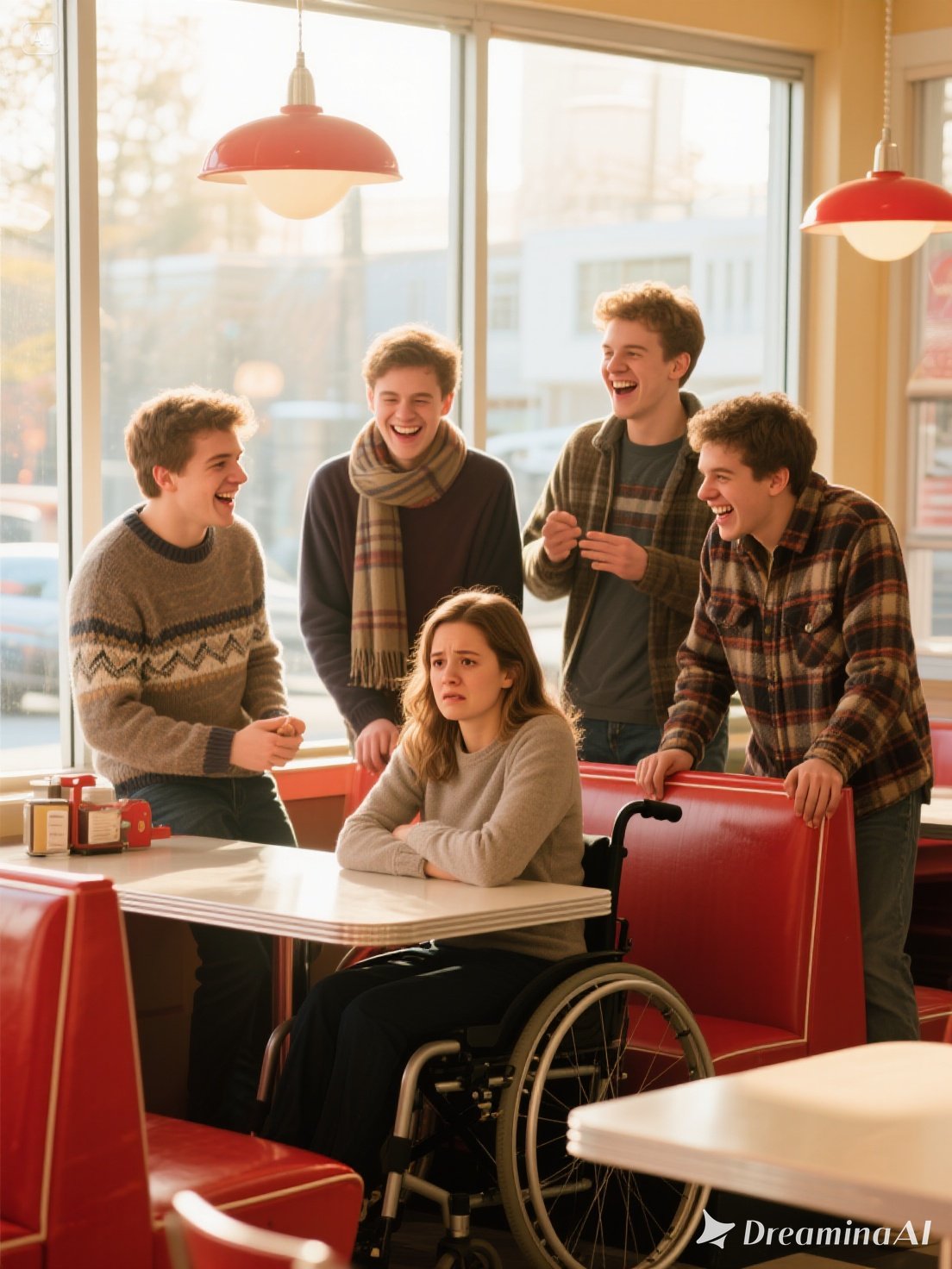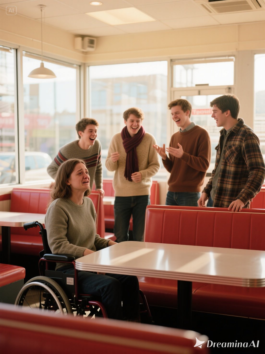 From a nearby booth, a group of teenage boys began to snicker. One “accidentally” tipped his plate, sending pancakes crashing to the floor, syrup pooling like guilt. Another nudged her wheelchair, making it shake.