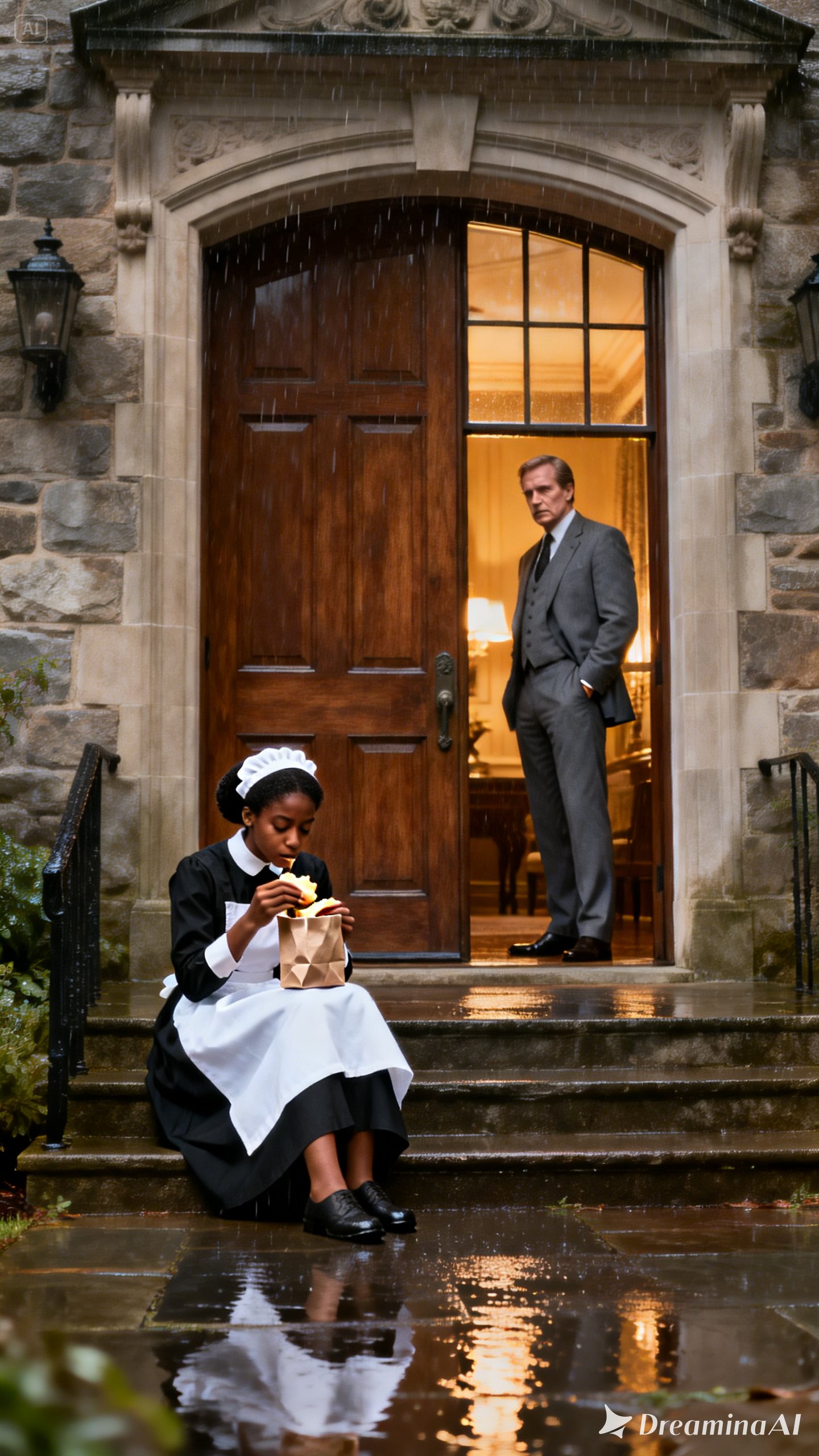 Outside an aging building, its façade worn by years of damp and neglect, a man sat on the crumbling edge of an old planter. He had no umbrella, no coat—only a thin jacket drenched through, clinging to his frail frame. And he was eating. A plain sandwich wrapped in brown paper rested in his rough hands.
