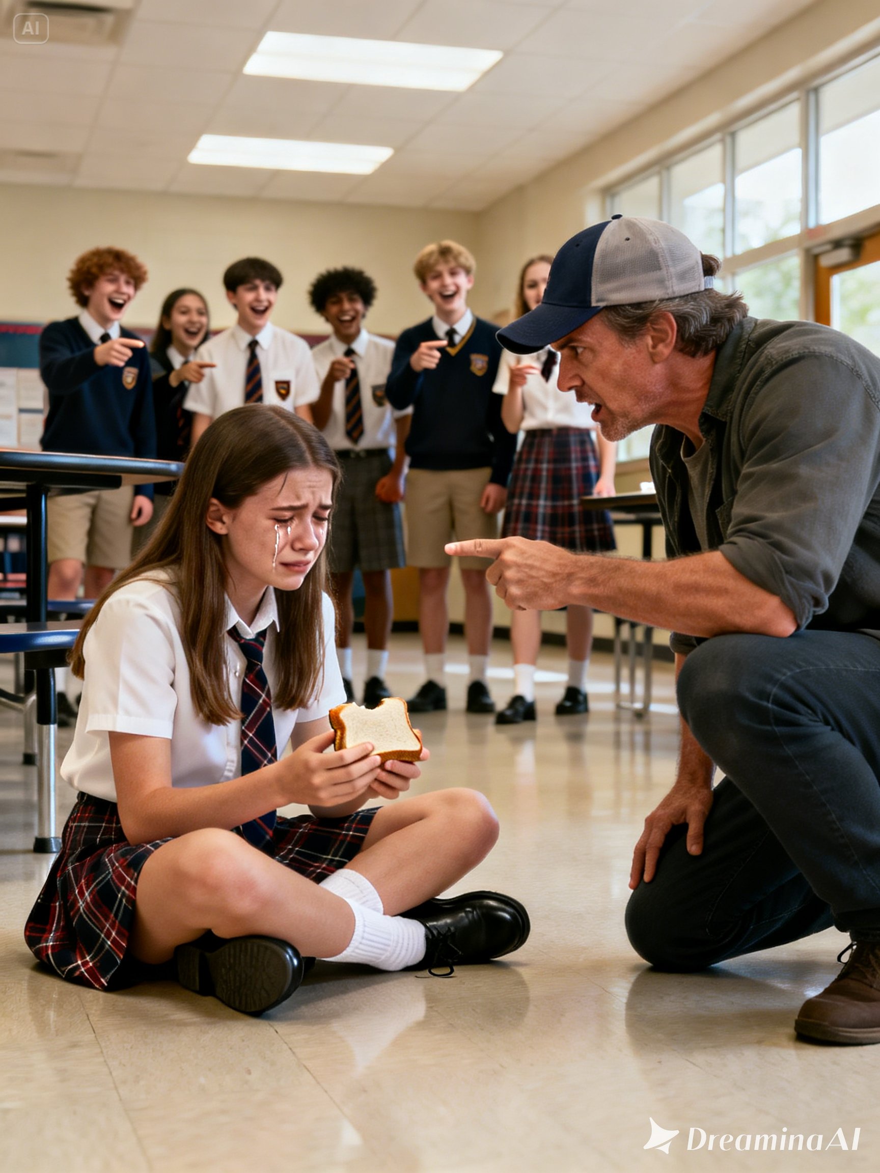 The cafeteria went still. Laughter died instantly. The clinking of trays and spoons faded away. Every gaze locked onto the man standing before Mia—plainly dressed, yet carrying sharp, commanding eyes.