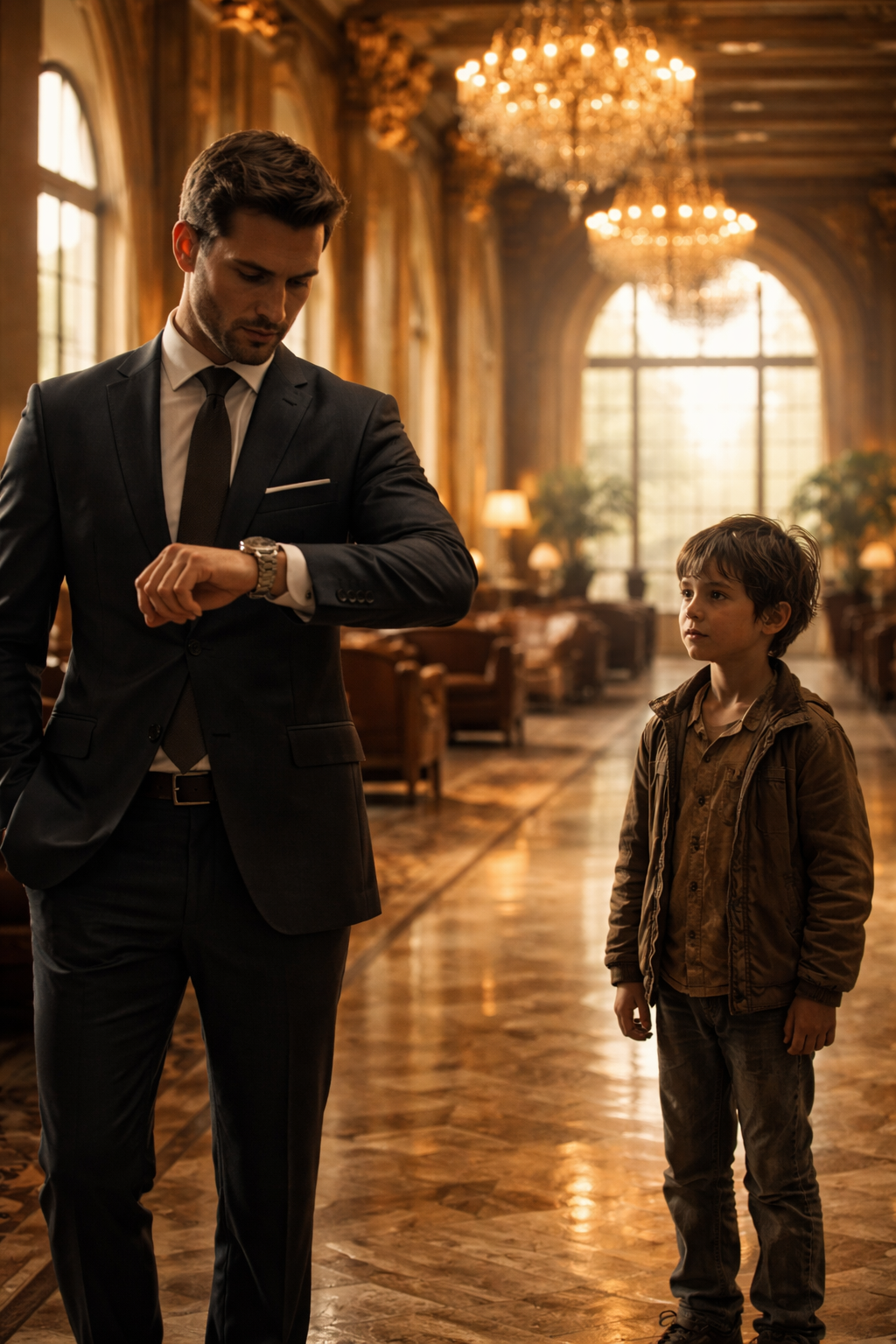 The lobby of the Grand Meridian Hotel sparkled beneath towering crystal chandeliers. Marble floors reflected a warm golden glow. Gentle piano music drifted through the space as guests in tailored suits and elegant dresses moved quietly between velvet couches and gleaming reception desks.