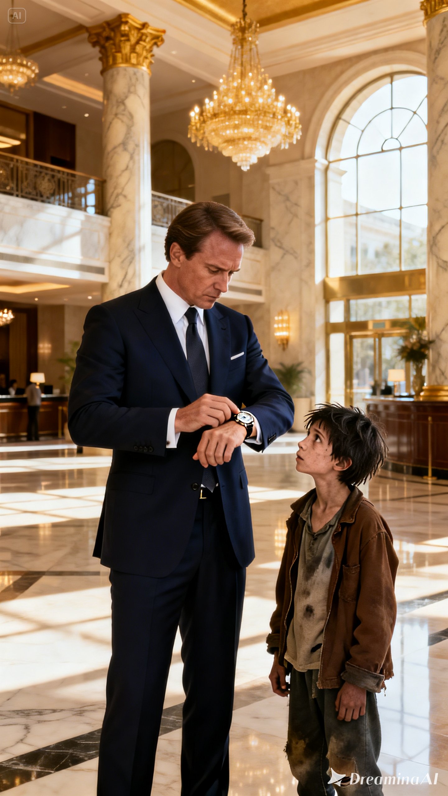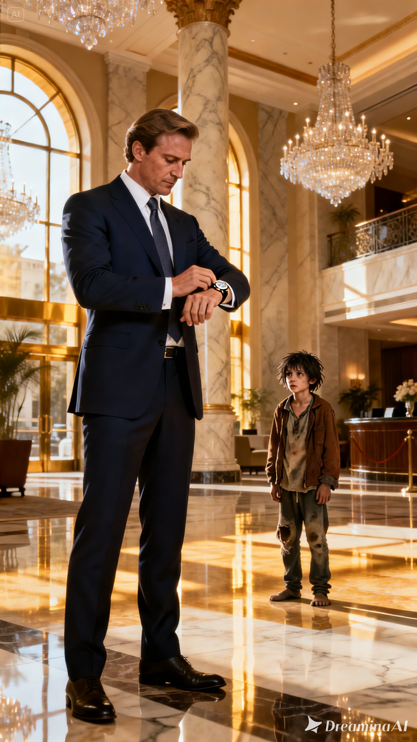 Across the lobby, a well-dressed man in a navy suit stood near the concierge desk. His posture was composed, his shoes perfectly polished, his hair neatly styled. On his wrist rested a silver watch—refined, classic, timeless.