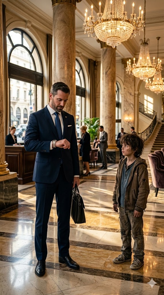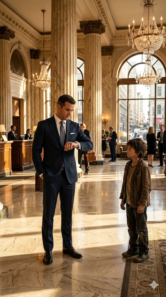 Every step across the marble seemed louder than it should have been. A few guests glanced his way with puzzled expressions. One hotel employee began walking toward him—but the boy had already reached the man.