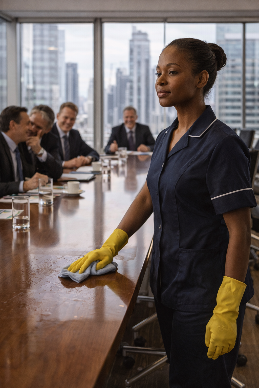 The other board members glanced at Evelyn with unease and irritation, fully expecting her to bow her head and retreat as she always had. But she remained where she was. She stood upright, radiating a quiet dignity that seemed to dominate the room, transforming her cleaning uniform into something almost regal.