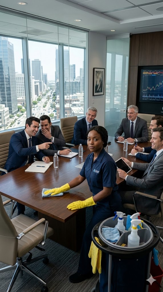 Within the polished marble halls and gleaming glass corridors of Hawthorne & Beck in downtown Dallas, there was one presence everyone noticed but no one truly saw: Evelyn. In her mid-fifties, she moved with calm, measured steps, guiding her gray cleaning cart as faithfully as the sunrise. She wore her dark green uniform not merely as work attire, but as armor—a mantle of invisibility that let her pass through boardrooms and executive suites without anyone lowering their voices or pausing their confidential conversations.