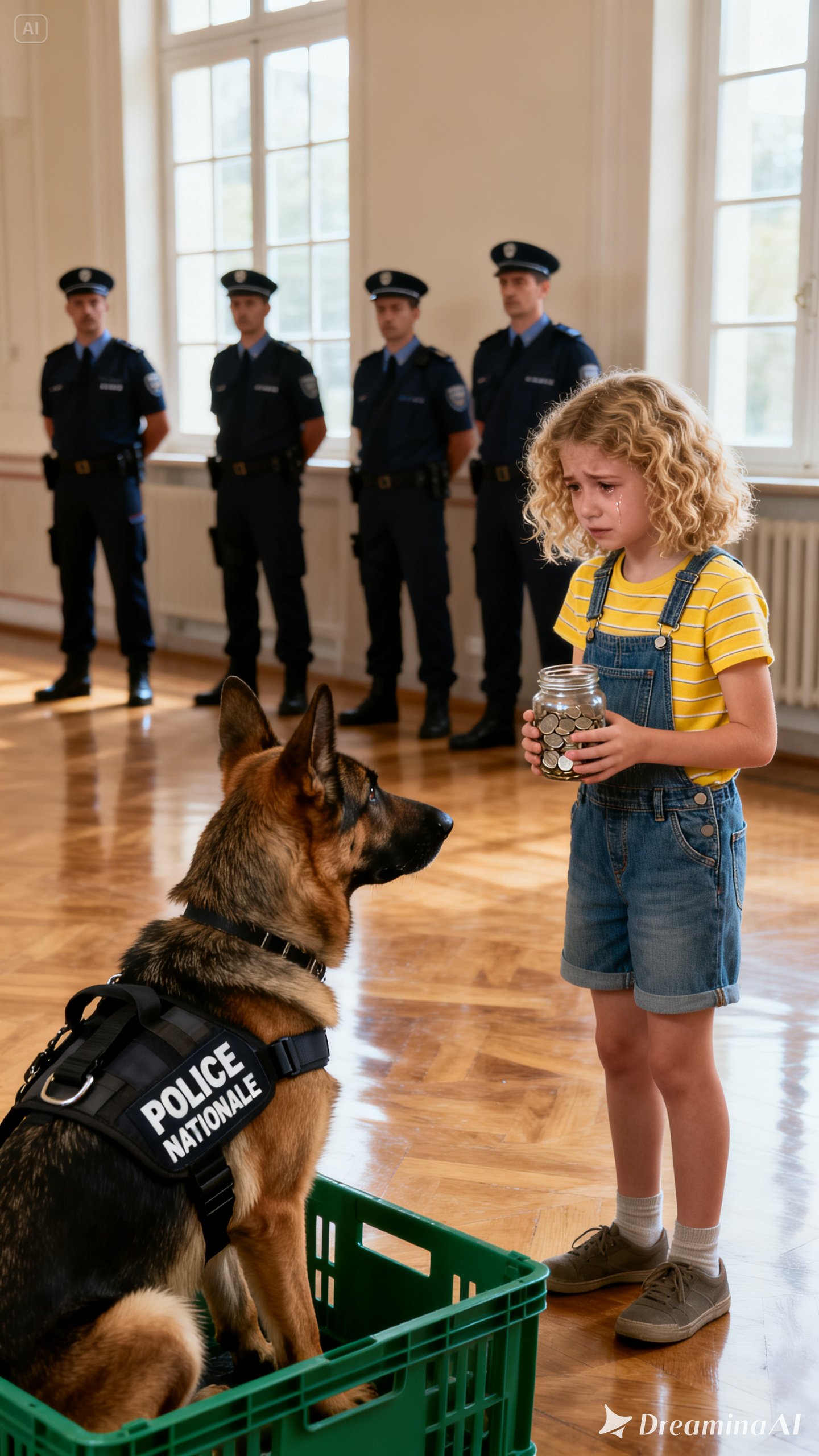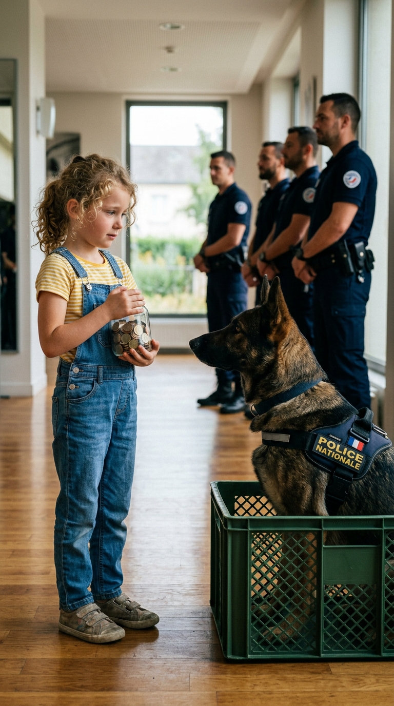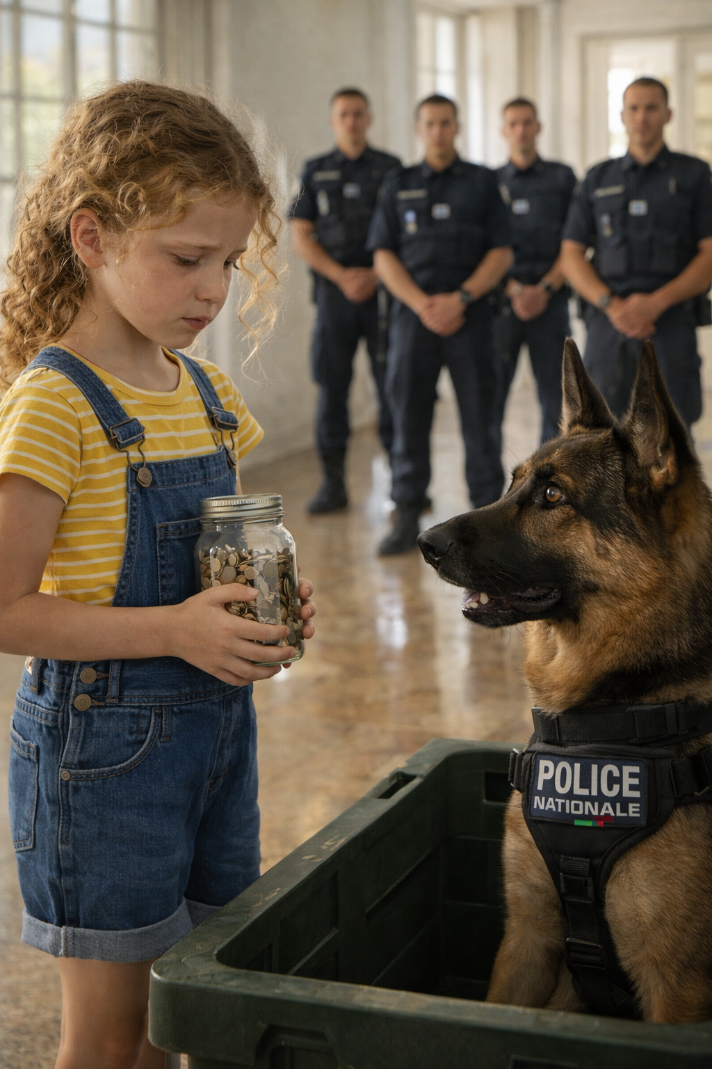 Léa Laurent wasn’t the type of child to stumble into forbidden places by accident. At eight years old, small, quiet, but fiercely determined, she pushed open the heavy oak doors of the Hôtel des Ventes des Domaines in Lyon. Her yellow boots, soaked by the icy October rain, squeaked softly on the marble floor, but she paid no attention. Clutched tightly to her chest was a large glass jar filled with coins. Every step was heavy with purpose; a mission that mattered more than anything, making her heart pound in her tiny chest. She hadn’t come out of curiosity—she had come to save Tango, the Belgian Malinois, a former elite dog of the Anti-Crime Brigade, and the loyal partner of her mother, Captain Élise Laurent, who had tragically died seven months earlier in a disastrous operation.