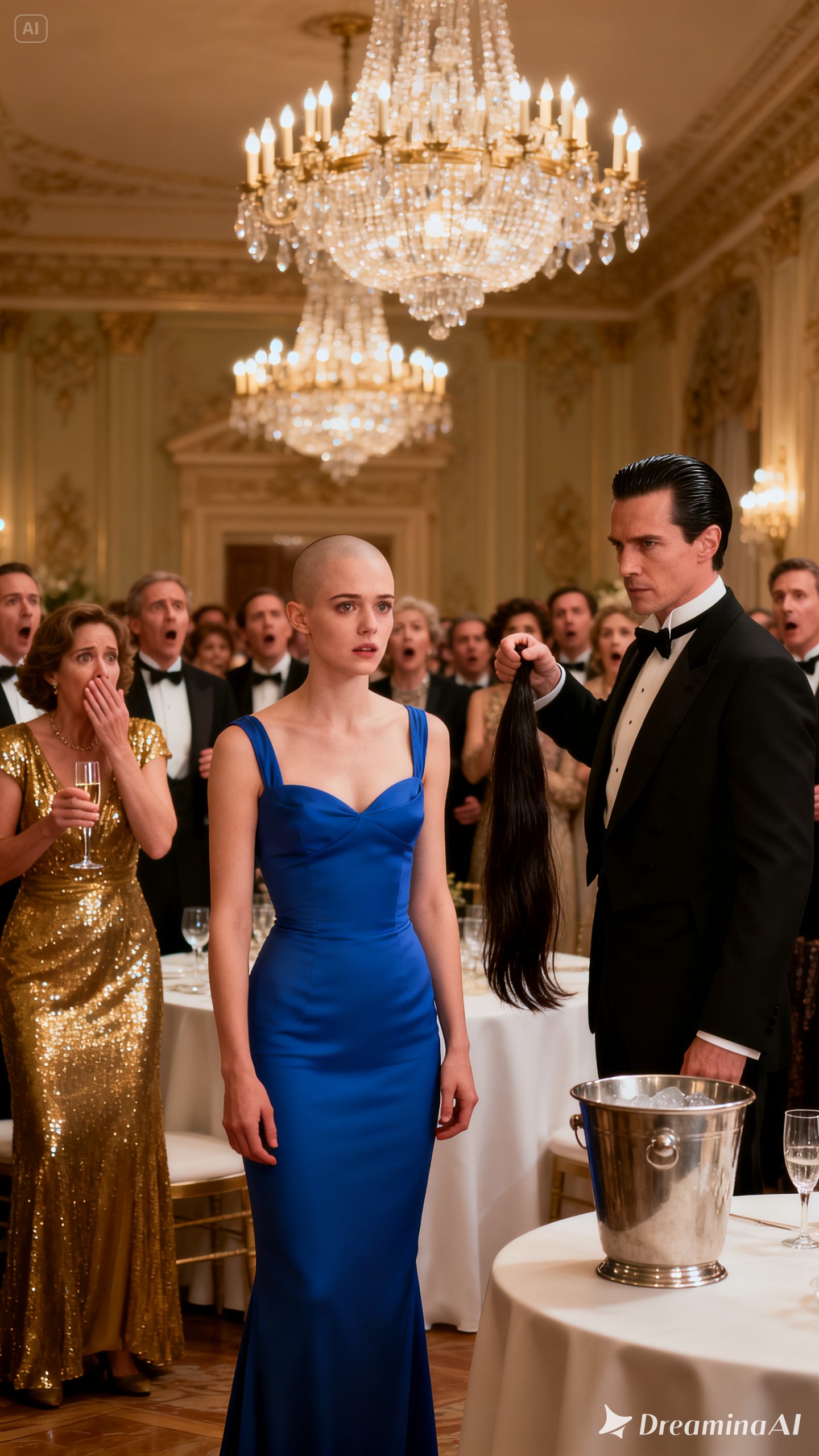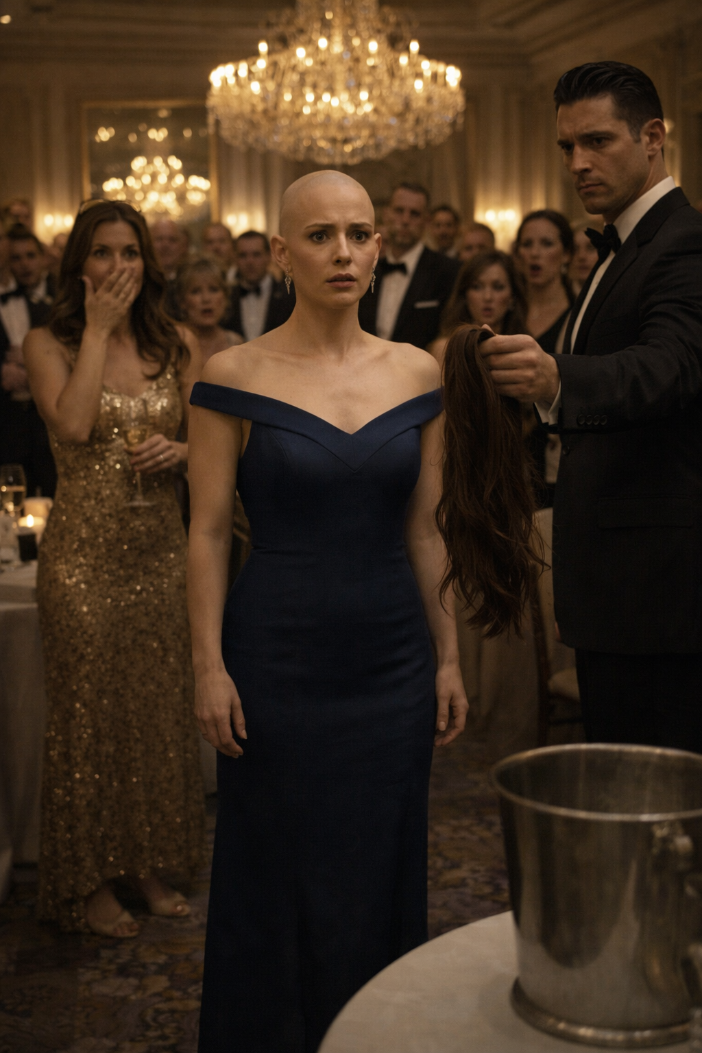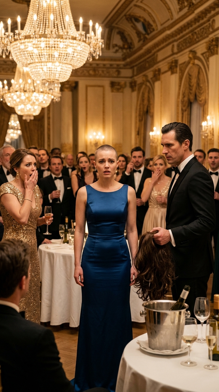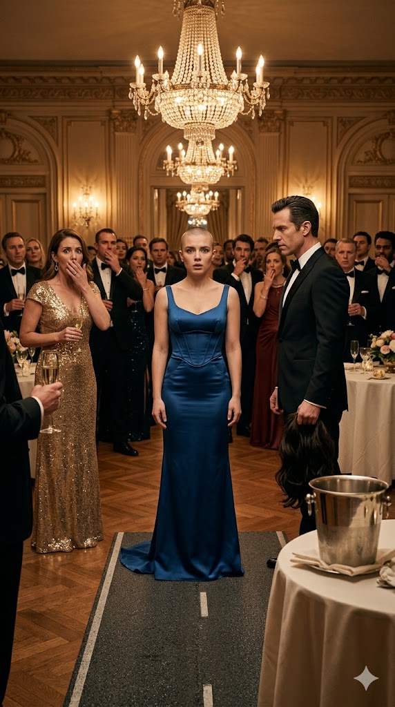 Waiters halted mid-step, trays suspended in the air. The jazz quartet kept playing, but the music faded into something distant, almost surreal. Patricia lifted a hand to her uncovered head. Her scalp shone beneath the lights—bare, exposed, real. She didn’t scream. She didn’t cry. She didn’t shrink away. Instead, she raised her chin and let her steady gaze move across the room, a calm that unsettled everyone more than any outburst could have.