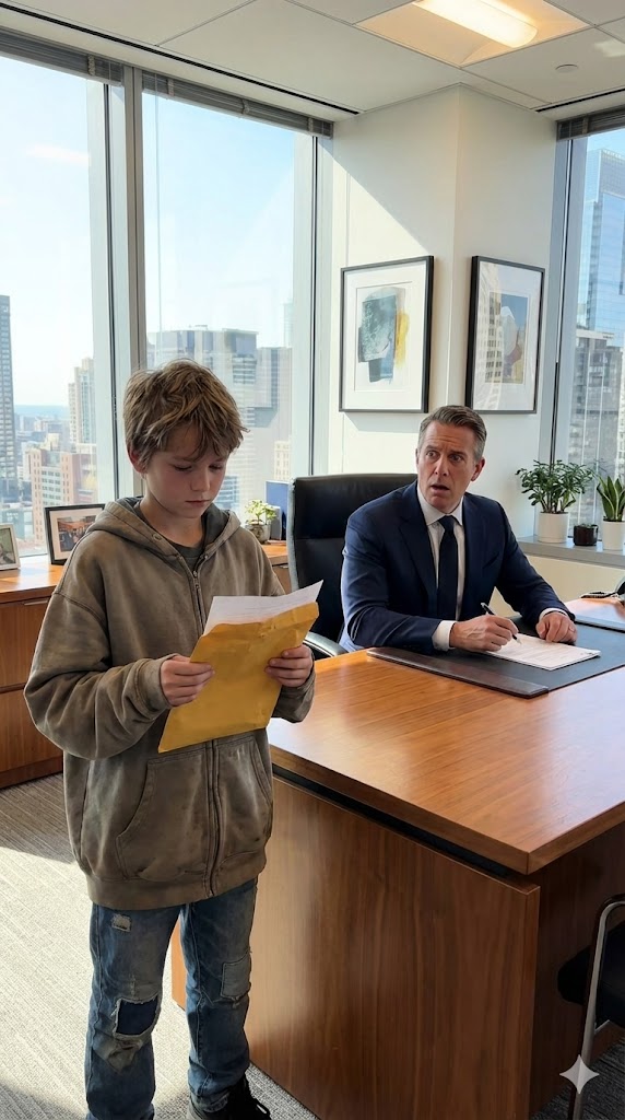 Elena nodded and slipped away. Moments later, the door opened again. And there he stood. A child. Small, yes, but carrying a presence that strangely filled the expansive office. His clothes were worn and faded, though clean—patched jeans, an oversized T-shirt, and sneakers with nearly smooth soles.