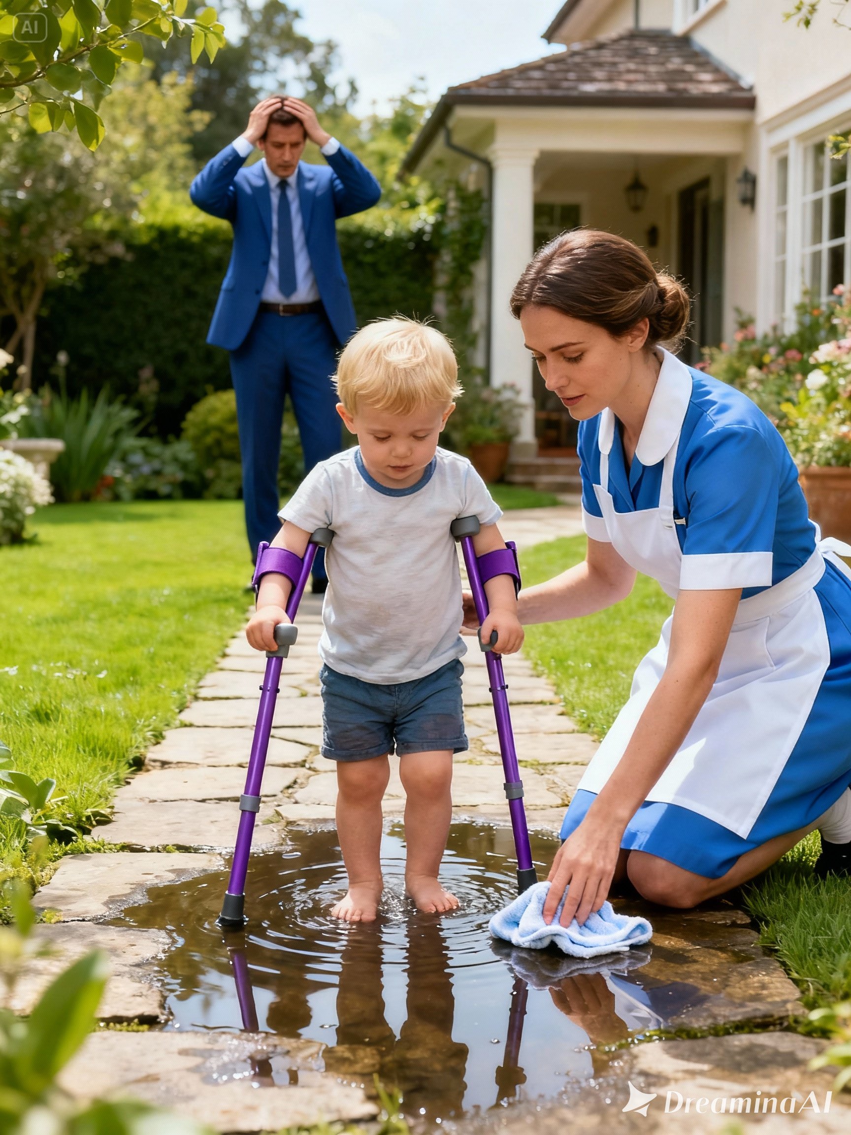 Alejandro looked at Lupita, who had lowered her head again. «Mateo, come here,» he said, kneeling to his son’s level. The boy approached, leaning on his crutches.