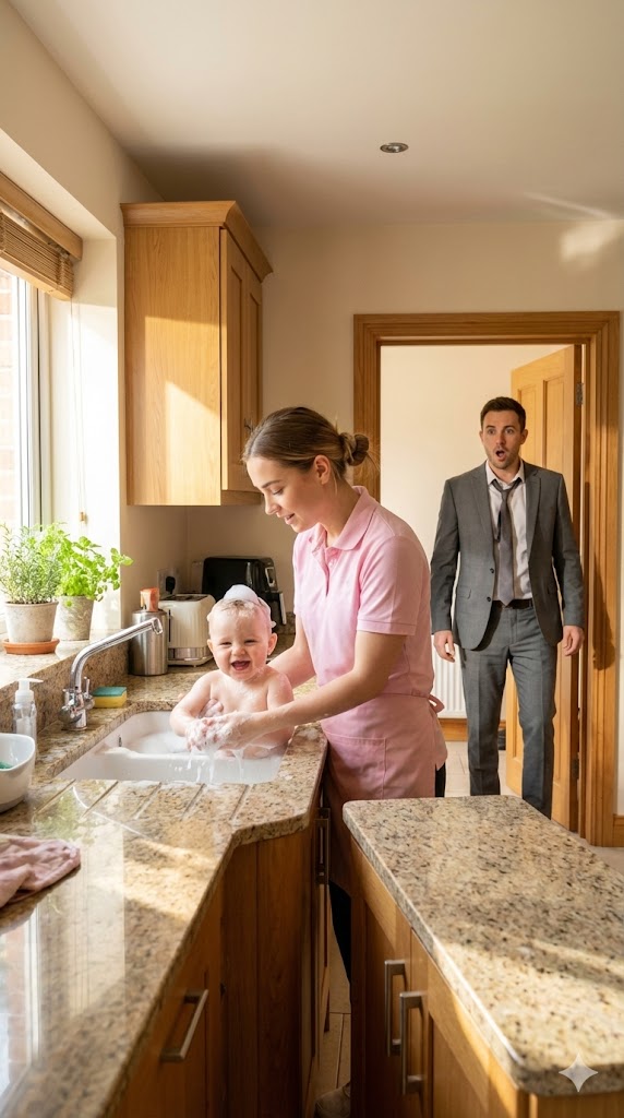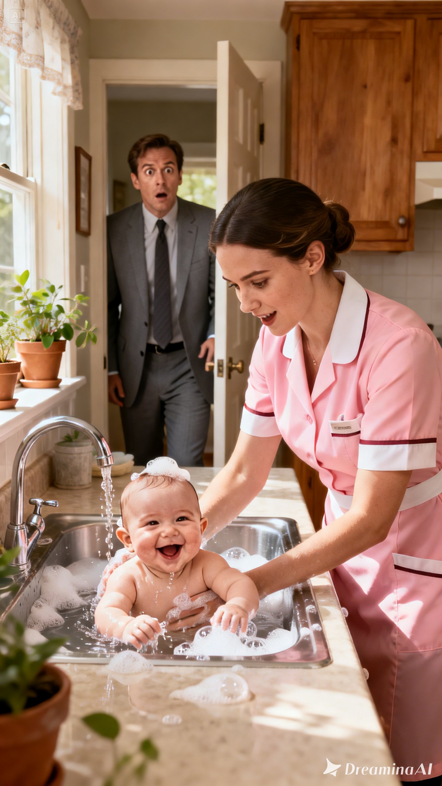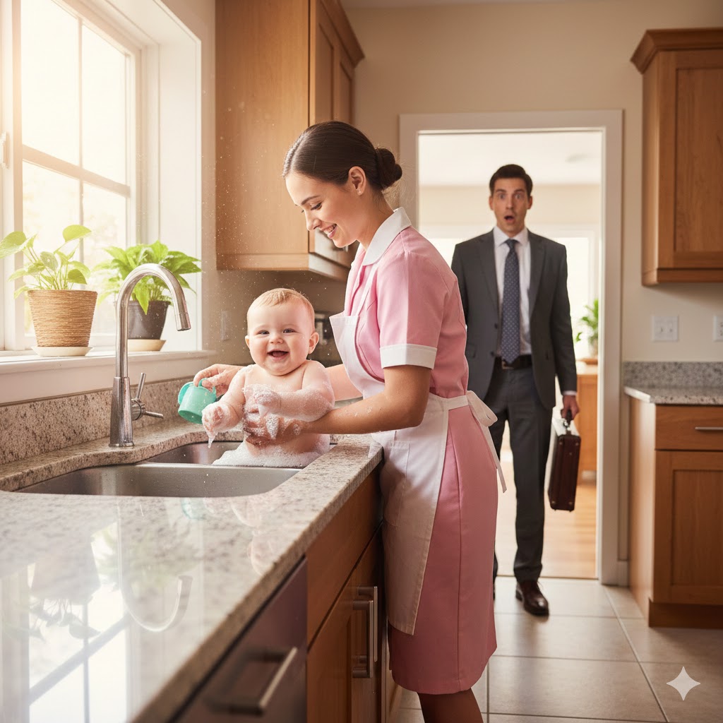 There was his son, perched on the marble sink like it was a throne, crowned with a mountain of foam, laughing with a pure, overflowing joy Santiago hadn’t seen in months—maybe years. And there she was: Isabela Santos, the woman he’d hired barely three months earlier. Her pink uniform sleeves were rolled to her elbows, and she softly hummed a tune while gently scrubbing the boy’s back.