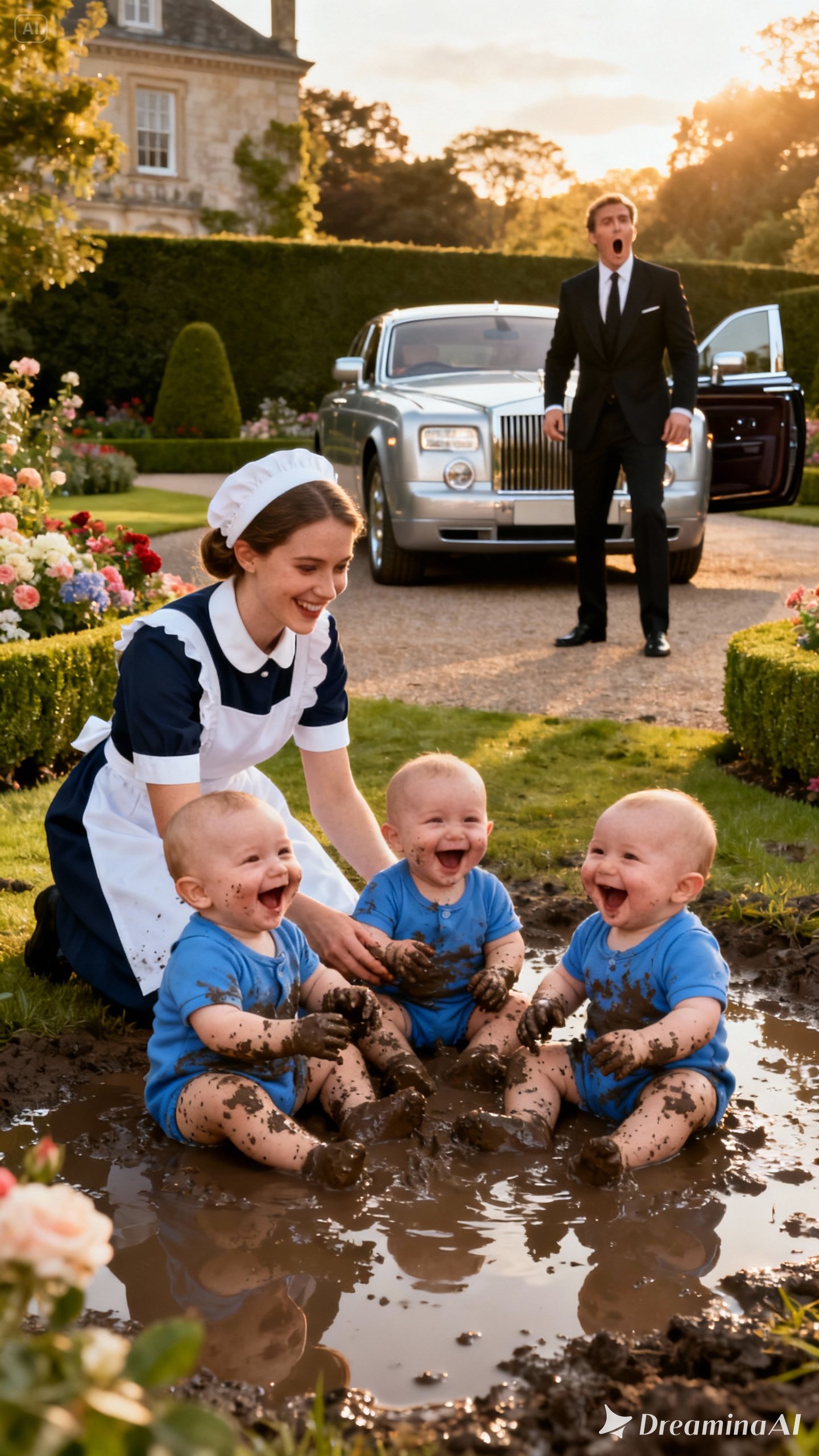 Three children, drenched in mud, were shrieking with delight as they jumped into a wide puddle, water splashing across the flawless lawn.
