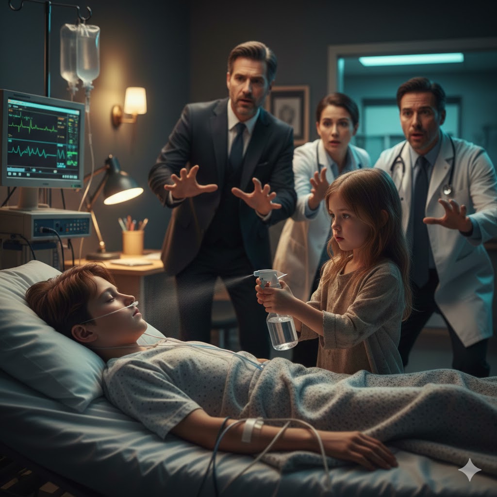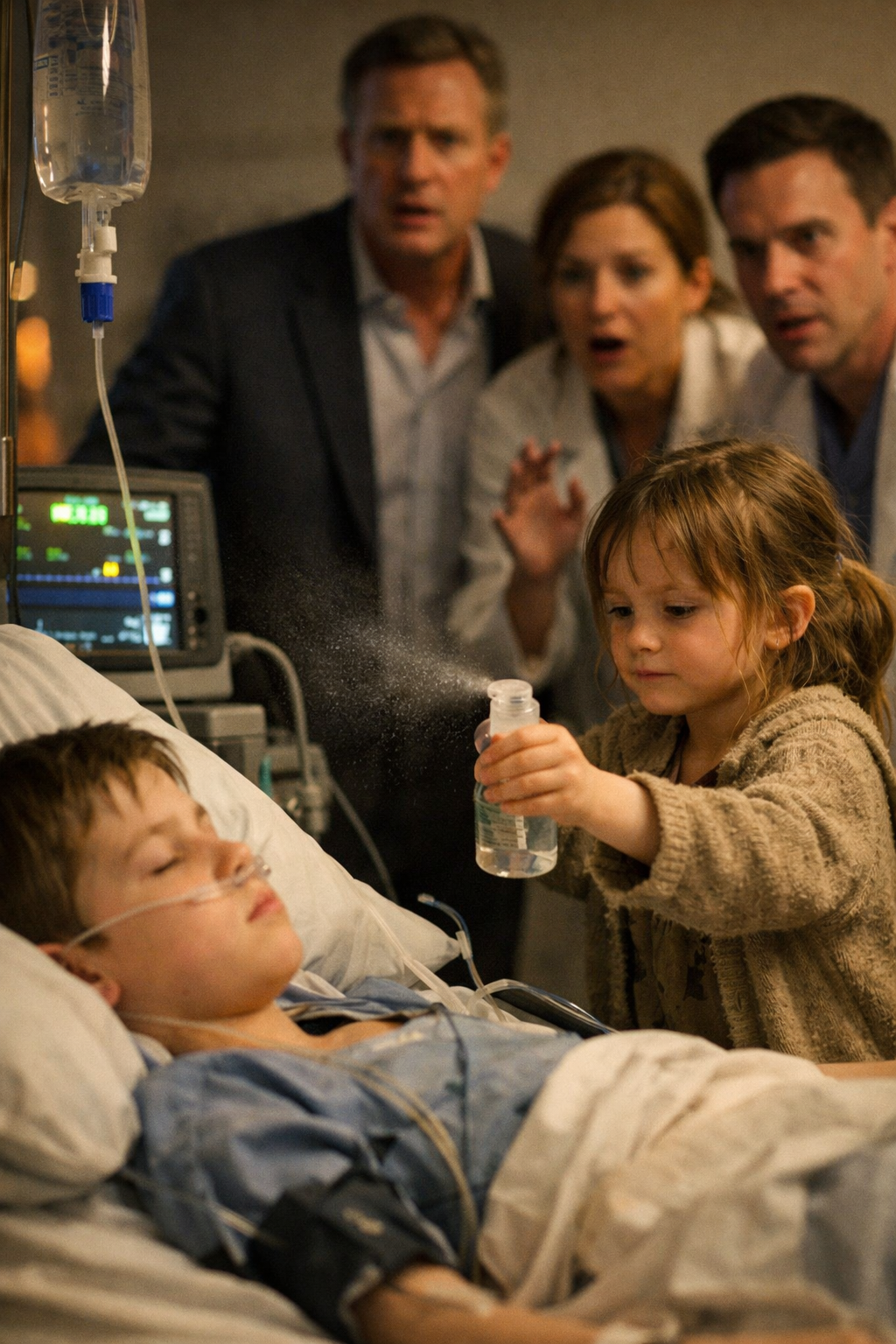 But the girl had already moved. With unexpected care, she twisted open the bottle cap. Elias and Sofia watched, frozen, as the blue-green liquid gently swirled inside. The girl raised the bottle and, with a soft, almost ceremonial motion, let a few drops fall onto Marcos’s face.