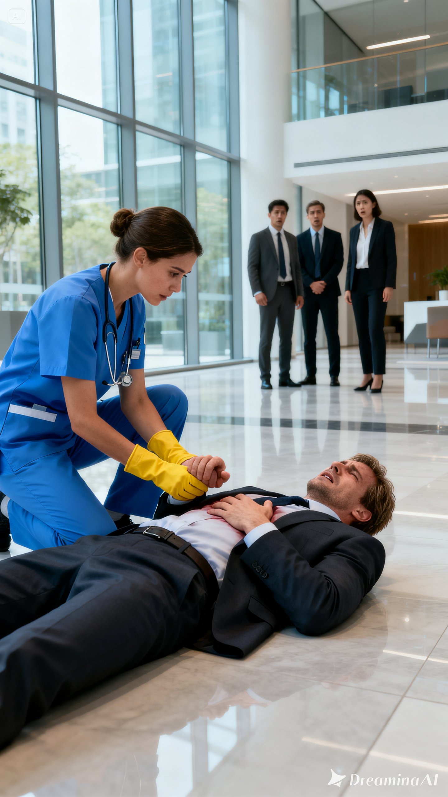 It wasn’t an awkward stumble. It was deliberate, precise—like everything he had ever built. He bent his knees, grabbed his chest with his right hand, let the phone slip from his fingers, and heard, like a gunshot, the sharp crack of it hitting the polished marble. Then he let his back rest against the cold glass wall of the corridor and slid down until he was seated on the floor, head lowered, breath uneven.