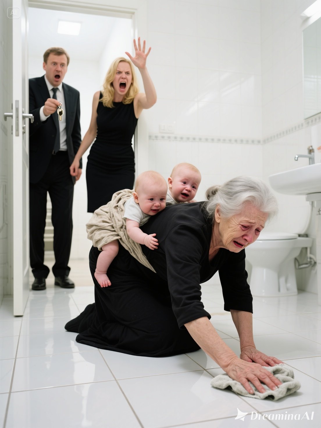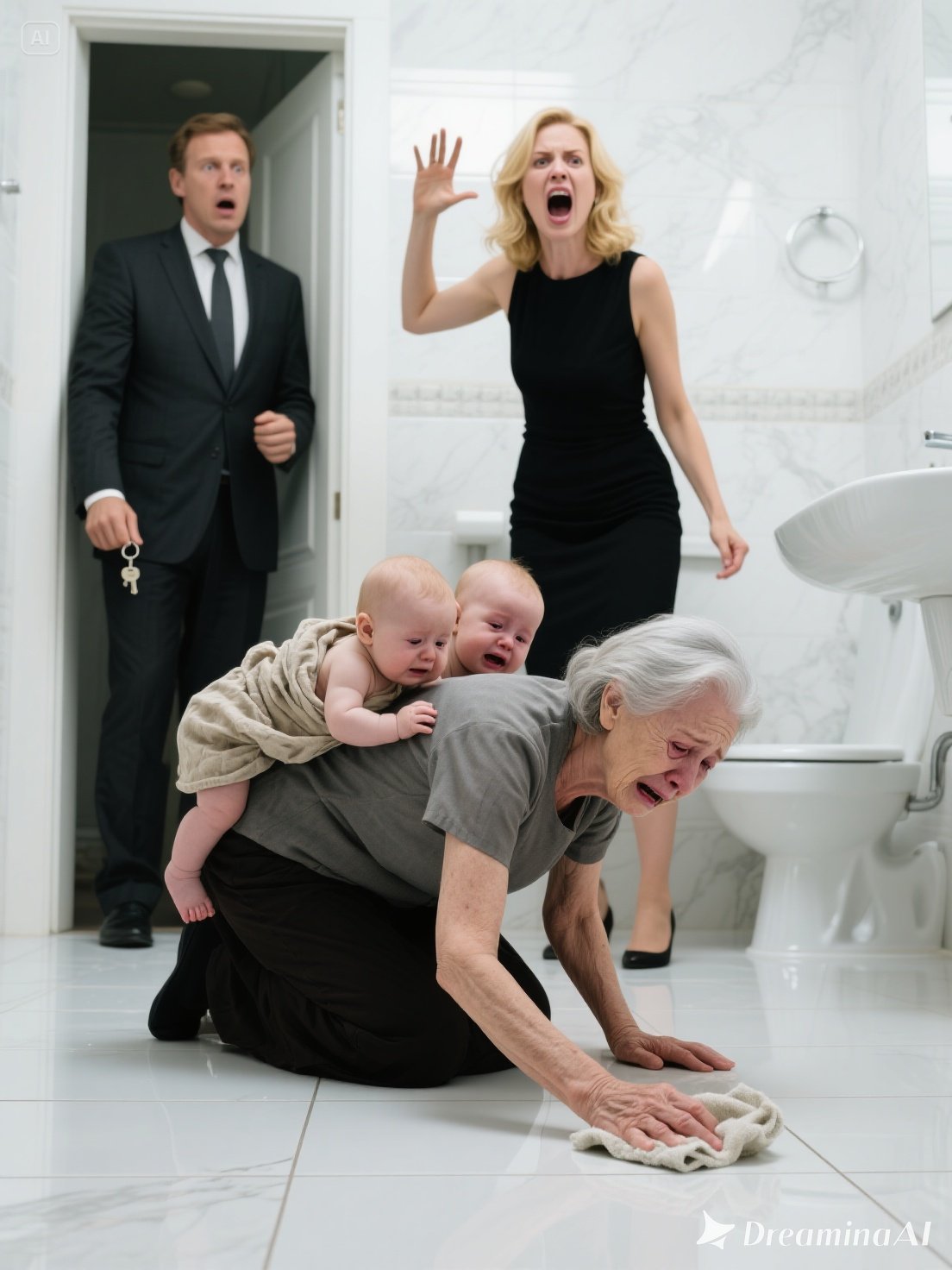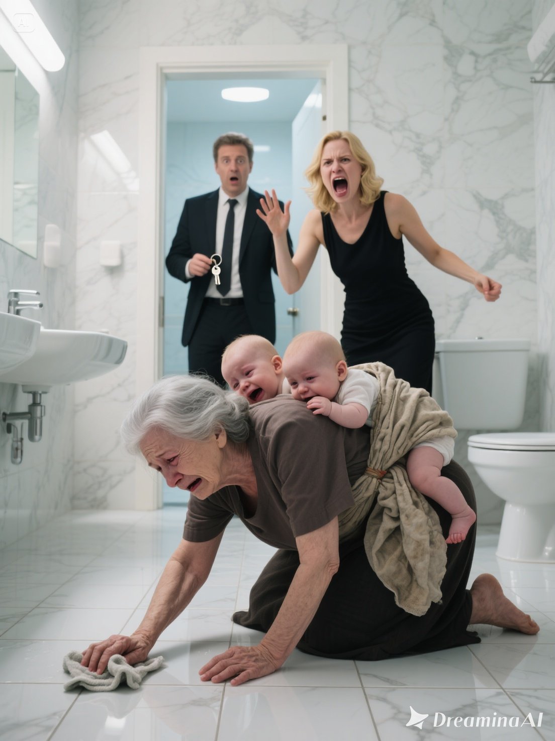 “You honestly believe,” I said slowly, “that it’s normal for a woman nearly seventy to be kneeling on marble, cleaning your bathroom floor with my children tied to her back?”