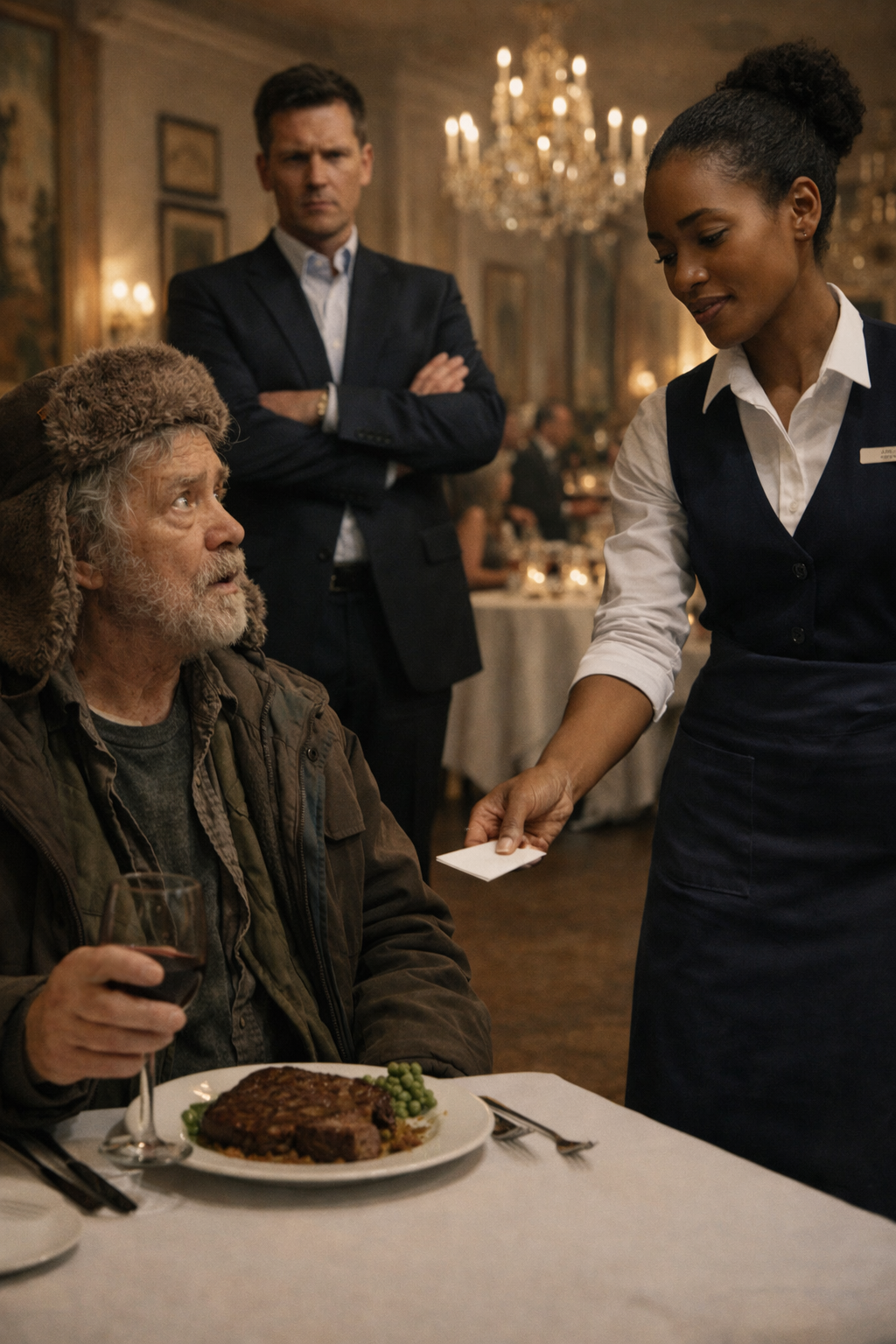 Alejandro waited until she was across the room. He unfolded the note beneath the table and read it once… then again… then a third time. Slowly, he lifted his gaze to the beautifully plated meat. A dish meant to harm him. A punishment for stepping into a place reserved for the wealthy. A cold, ancient anger settled inside him. He remembered being 23, starving, digging through trash. He remembered the chef who caught him—the boiling water, the laughter, the cruelty. The scar on his hand throbbed. He had built his empire so no one would ever endure that again. And now, in his own restaurant, someone was trying to poison a defenseless man. He placed his utensils down. He would not eat. He would not leave. He would watch—and when the moment came, he would tear this rotten system apart.