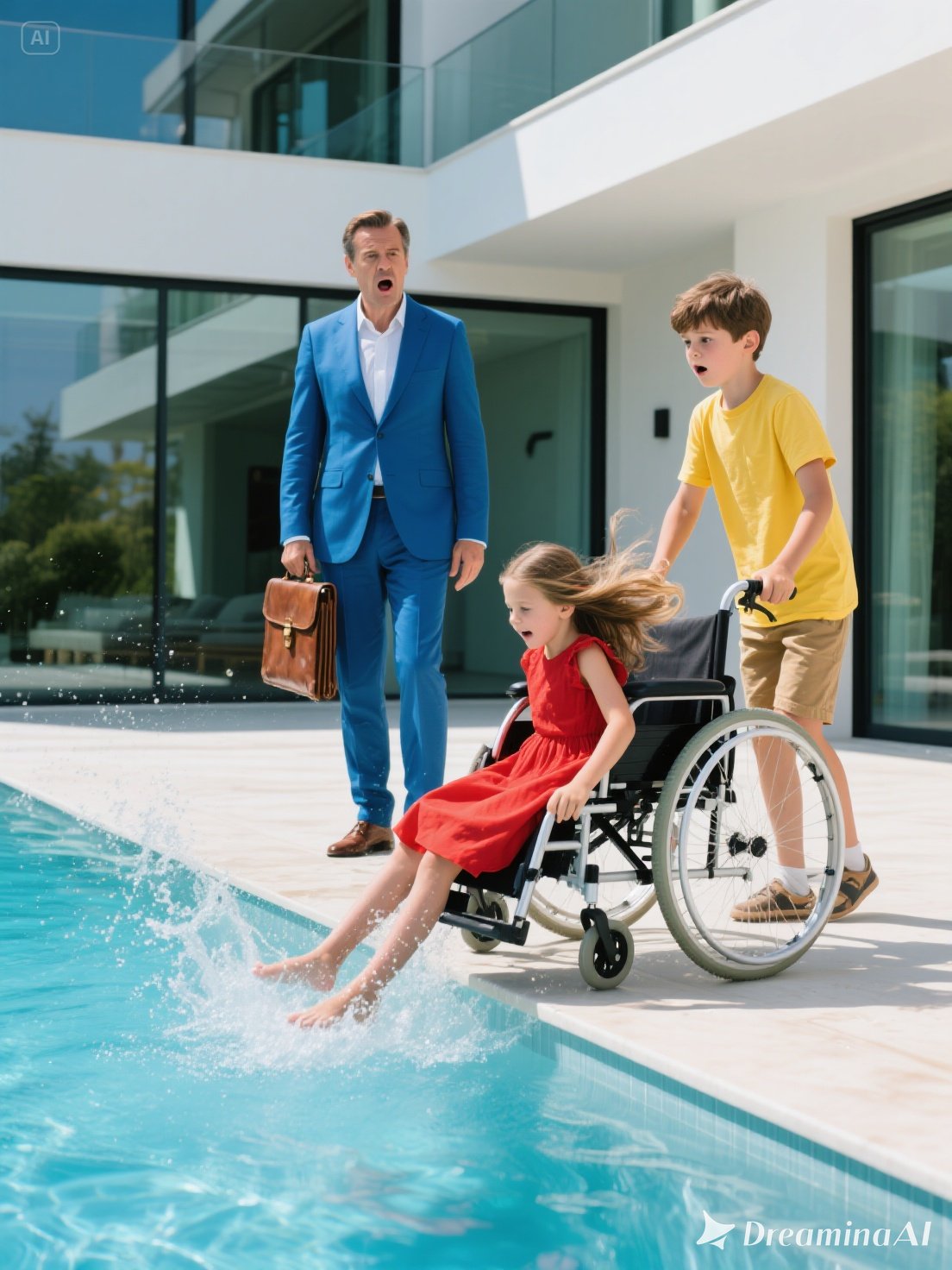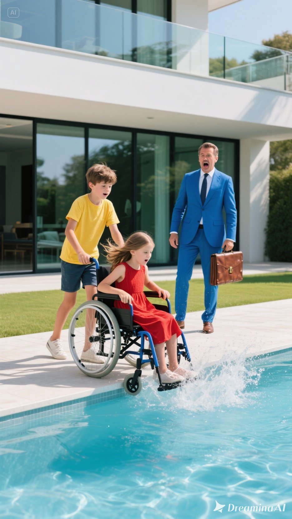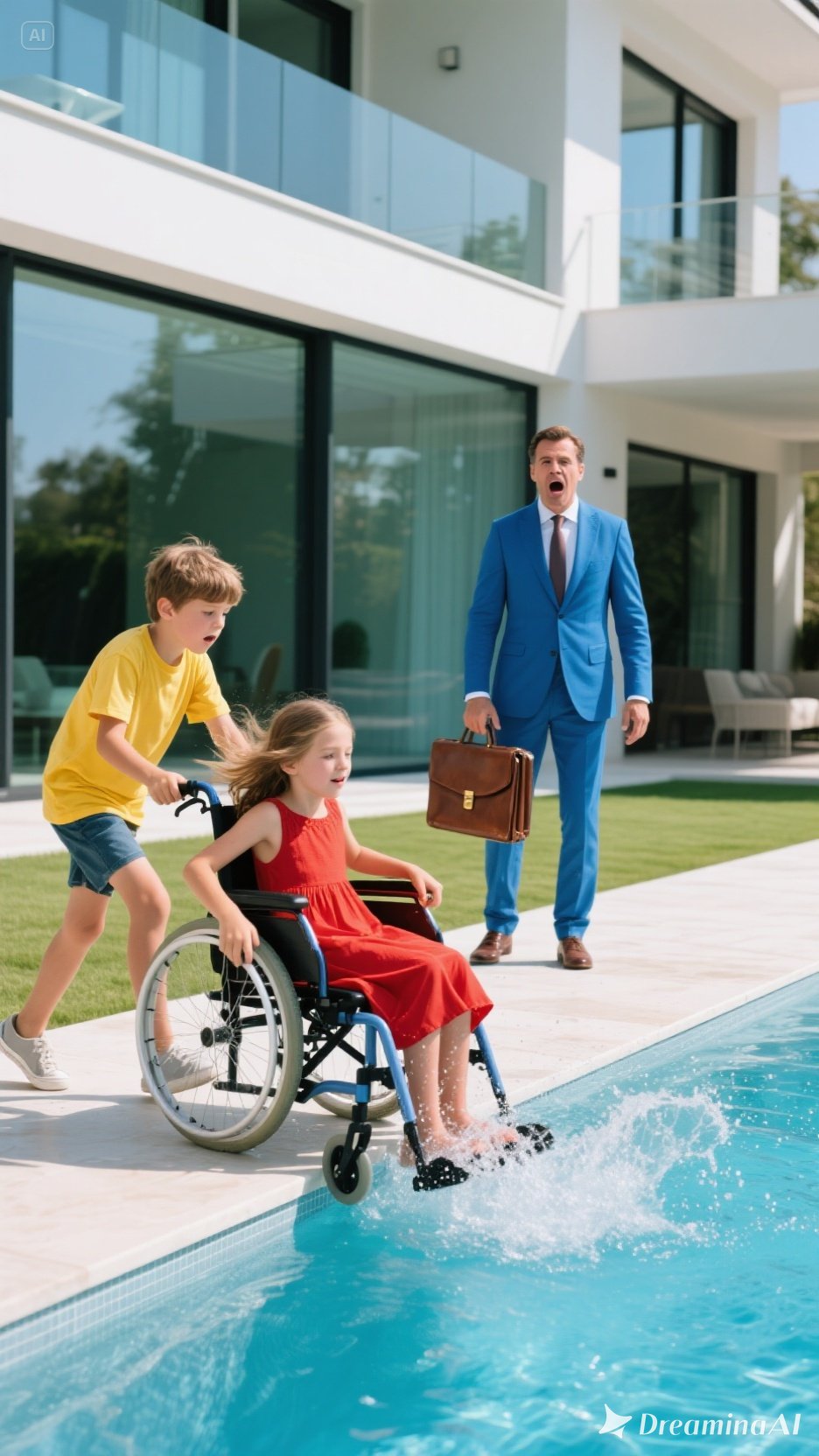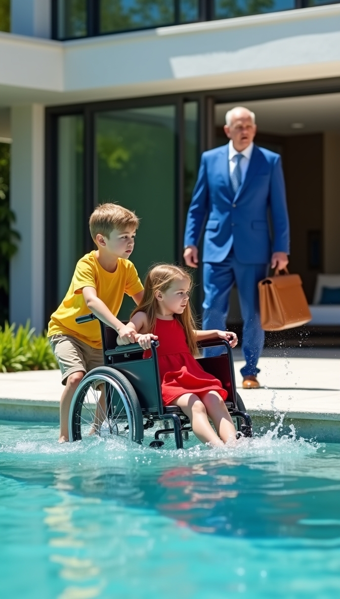 The wheels squeaked a little as he pushed it across the stone tiles, stopping right at the edge of the pool. He glanced down at the water, then back at Claraara. Her eyes were still wide open, watching. He took a deep breath, looked around once more, and without thinking twice, pushed. The chair rolled forward, tilted, and fell into the pool. Marina’s scream broke the silence. She had just stepped out onto the patio and had seen it happen. Victor heard the noise and ran outside in terror.