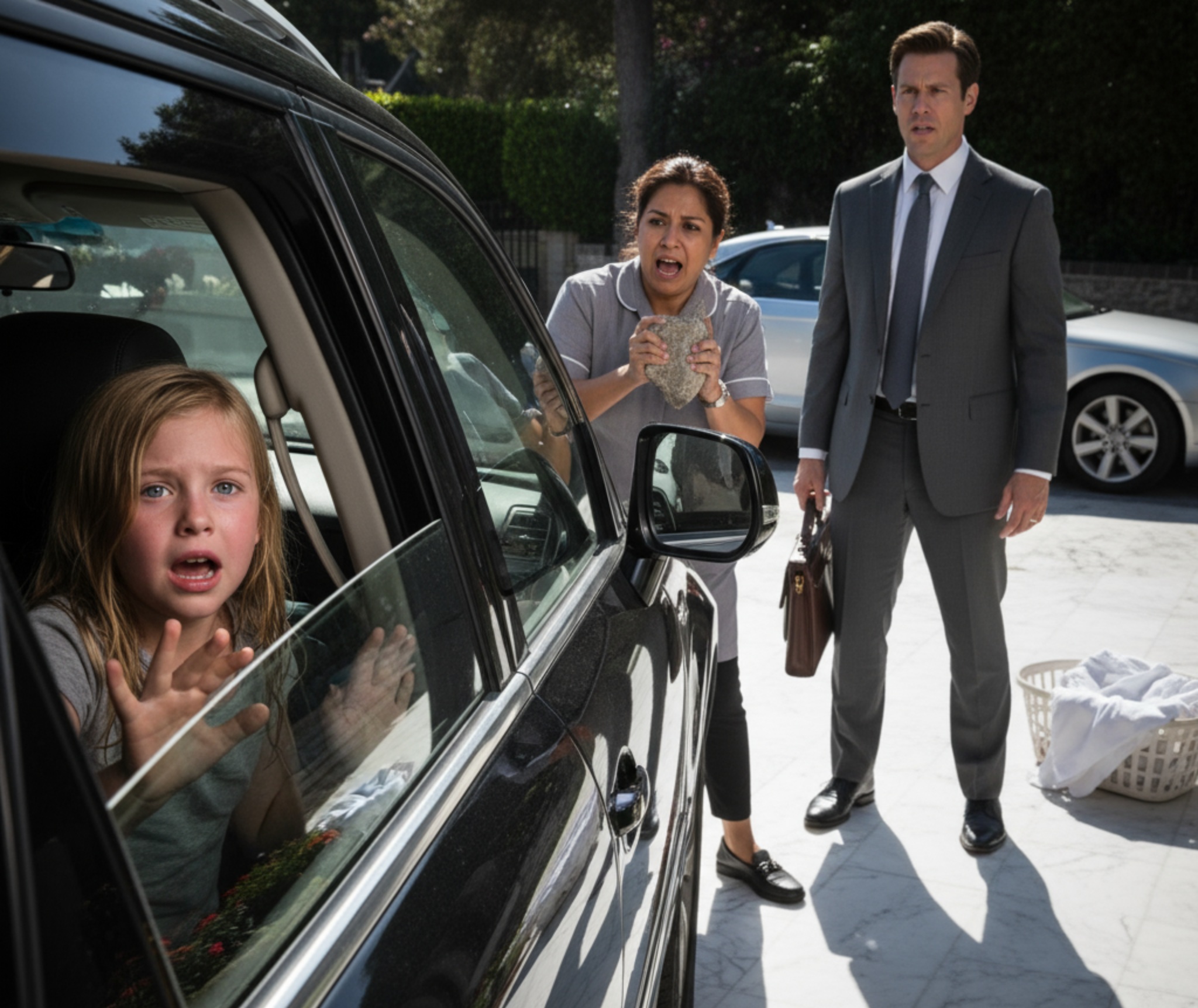 “Miss Lily!” Maria screamed, dropping the basket and sprinting toward the car. She yanked the handle. Locked. The heat seared her palms through the glass. Panic surged.