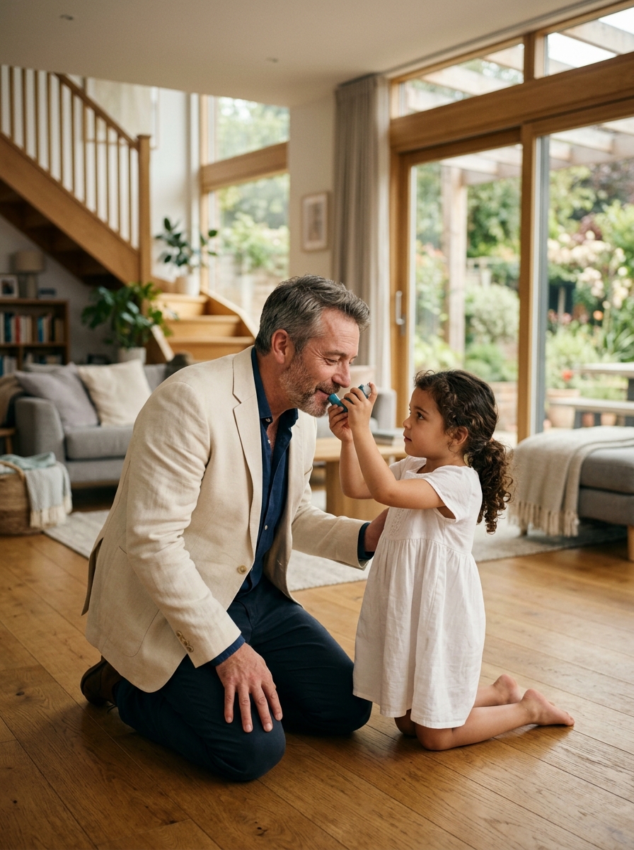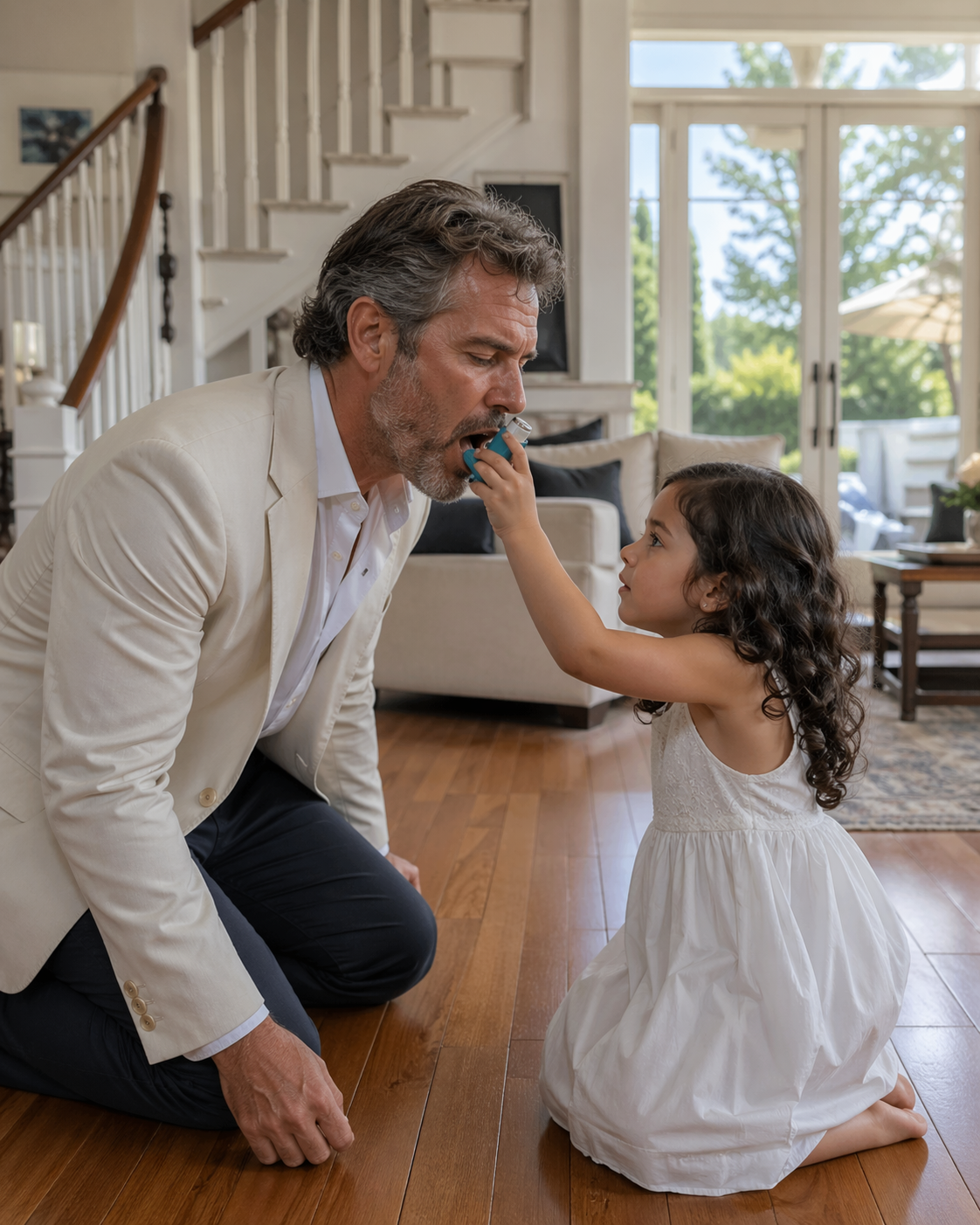 With remarkable courage, the little girl knelt beside the fallen man, placed the inhaler against his mouth, and pressed it twice with her small thumbs.
