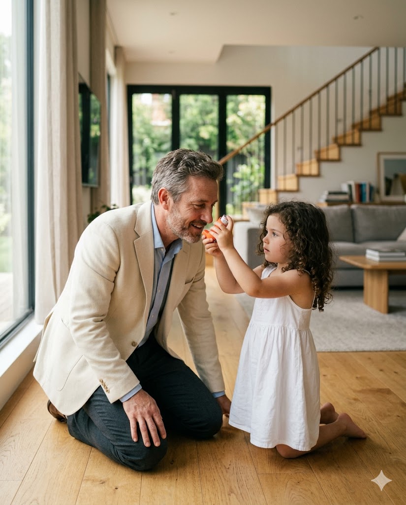 The little girl, now seven, ran across the grass in a sparkling dress and leapt into his arms. He caught her tightly, pressing a tender kiss to her forehead.