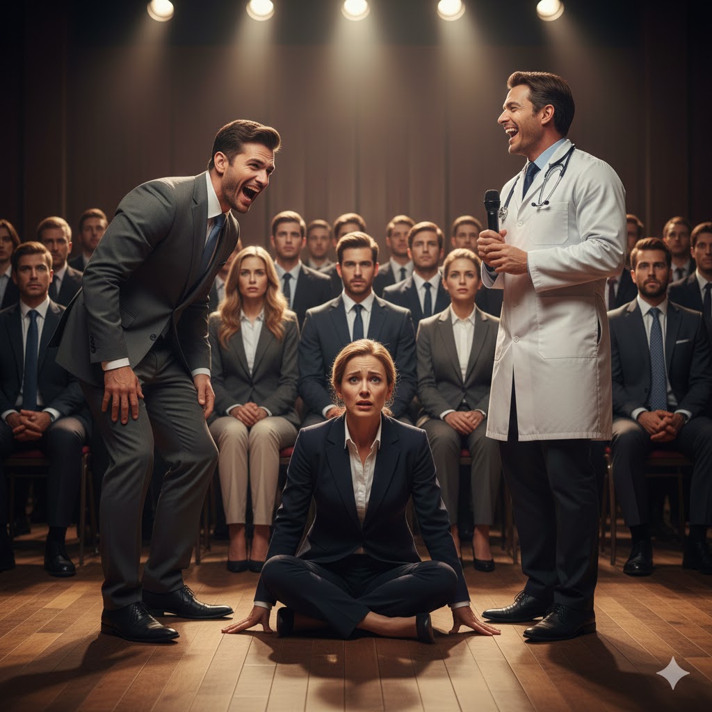 “Anxiety,” Dr. Hart said cheerfully into the company mic, smiling for the room as if making hospital rounds. “A little attention-seeking.”