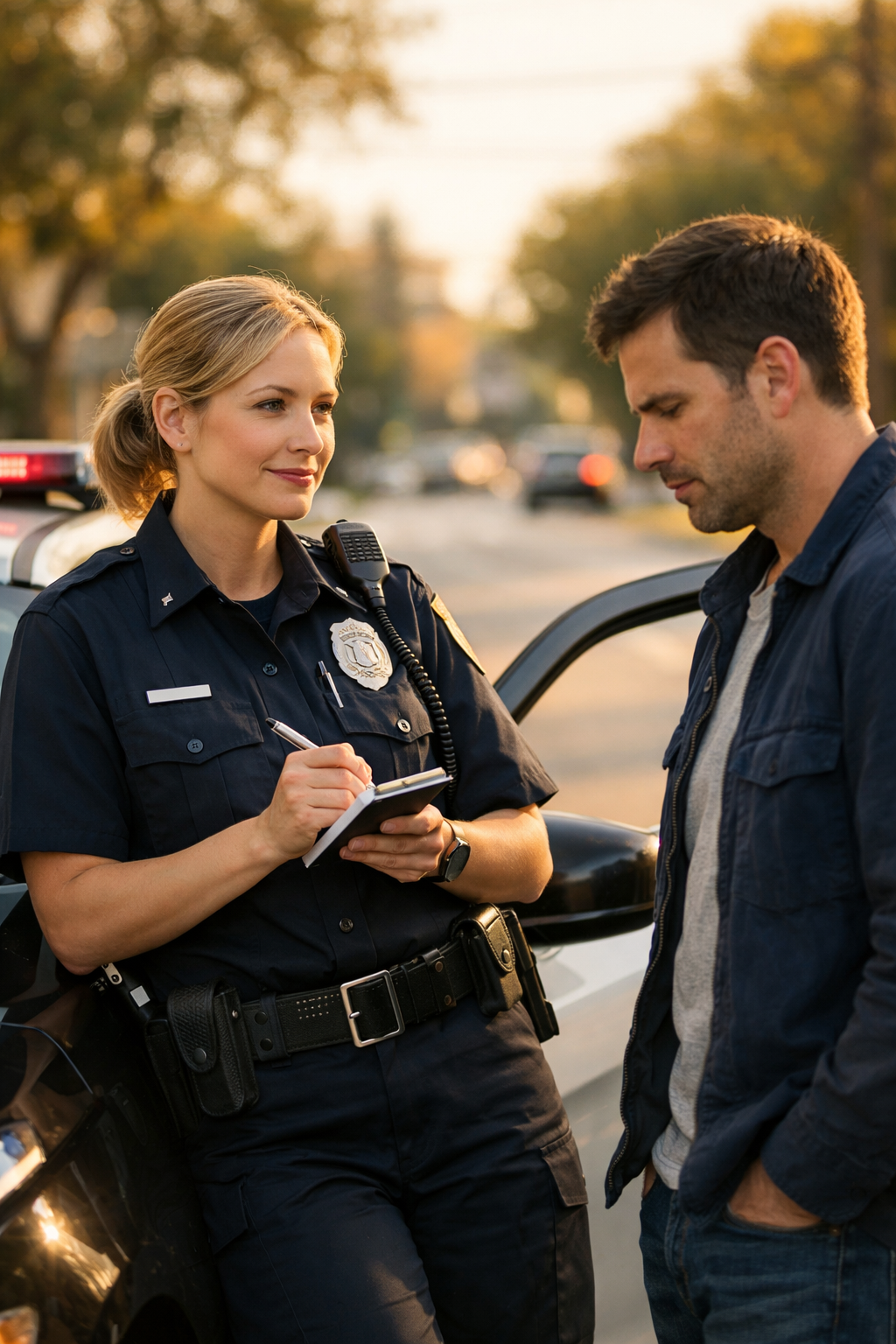 The officer stepped out of her patrol car. She looked to be in her late twenties, blonde hair pulled back neatly. Her uniform was sharp, her expression composed but not unkind. “Good afternoon, sir,” she said gently. “I’m Officer Emily Carter. Do you know why I pulled you over?”